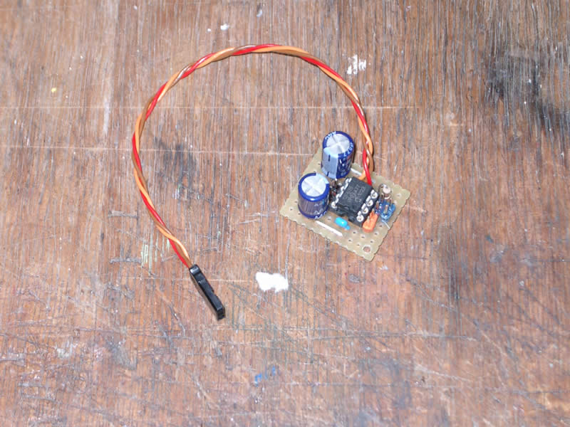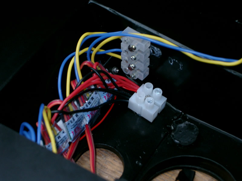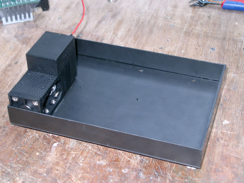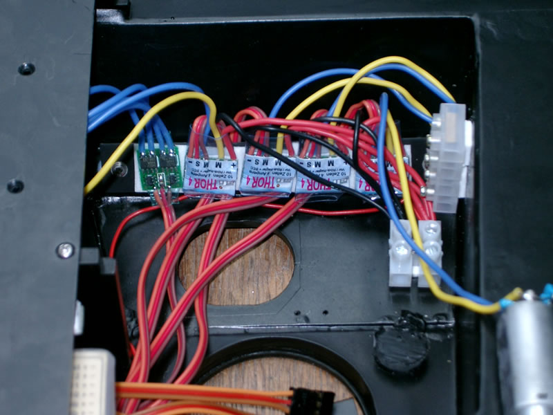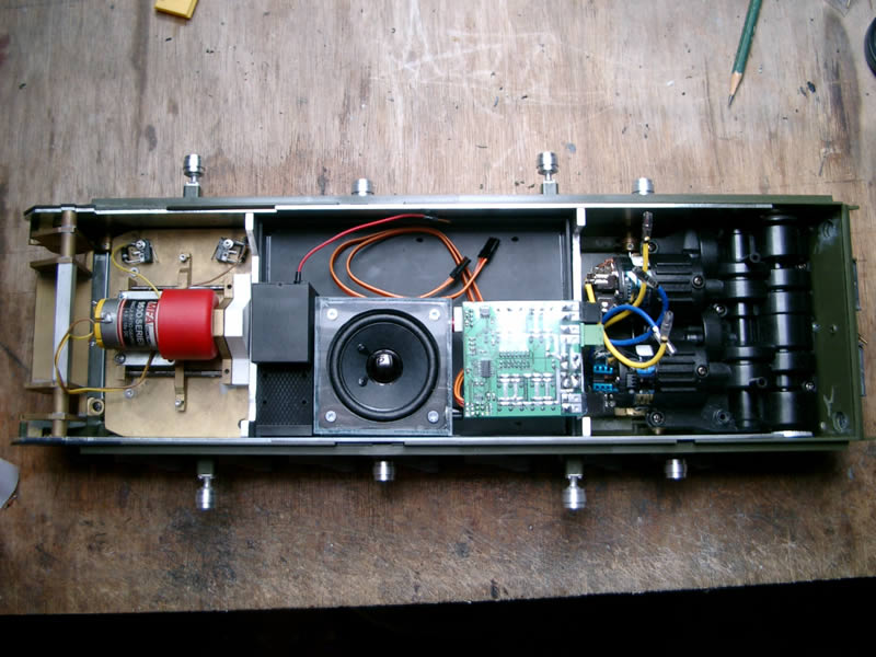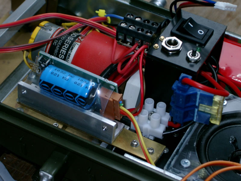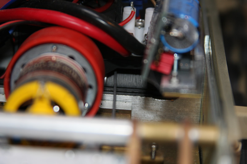 Weitere Sachen verbaut. In der Mitte der Ein-/Aus-Schalter mit Sicherung, Ladebuchse und Verteilerklemme. Auf einem Messingausleger kam der Verstärker, was gleichzeitig mit als Kühlblech diehnt. Der Akku ist ein 11,1V/5.000mAh-Lipo.