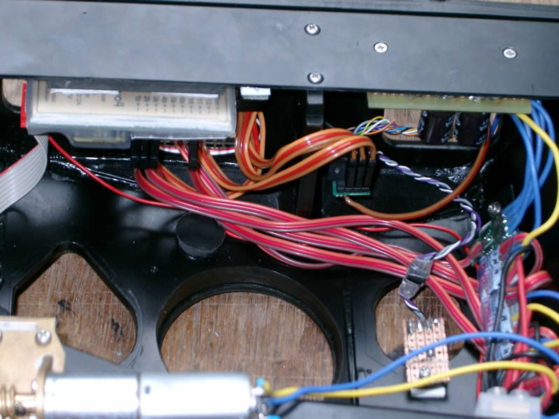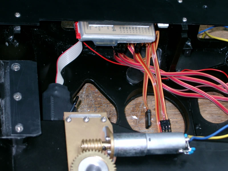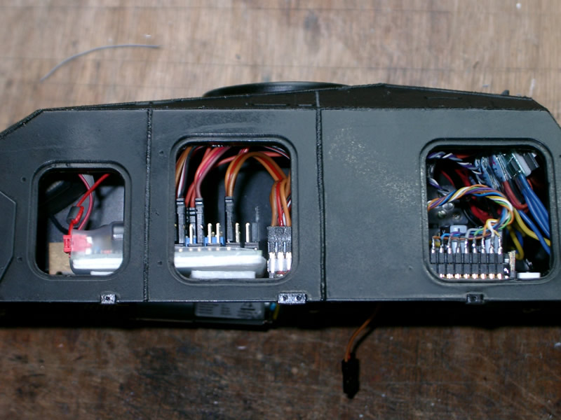 Hier schön zu sehen: Vorne der Empfänger, mittig an den drei Servosteckern ein TBS-Micro, rechts eine Verstärkerplatine für Schaltsignale. Die kleine Lochrasterplatine beherbergt den Anschluß an den Programmieradapter.