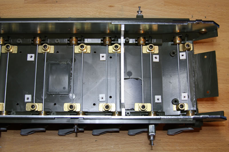 Mal die ersten Komponenten reingewürfelt. Bereits jetzt schon zu sehen, dass das verflixt eng wird. Zuerst hatte ich noch vor, eine servogesteuerte Laufwerksverriegelung nachzubauen. Das habe ich dann aber verworfen, da die Aufnahmen genau im Bereich des Getriebes liegen, wo ich keine Hebelei unterbekomme. Schade eigentlich.