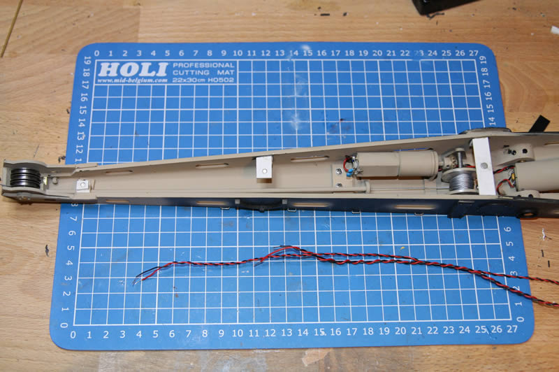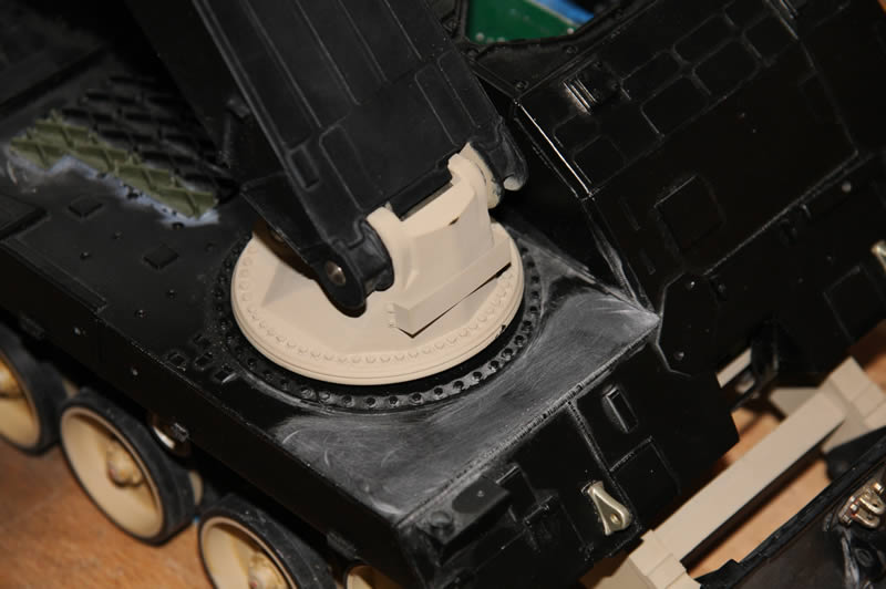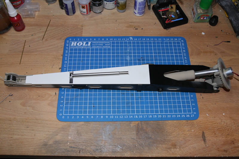 Hier die dazu gehörende Aufnahme unter dem Kranarm, bereits fertig lackiert und mit Glanzlack für Decals vorbereitet.