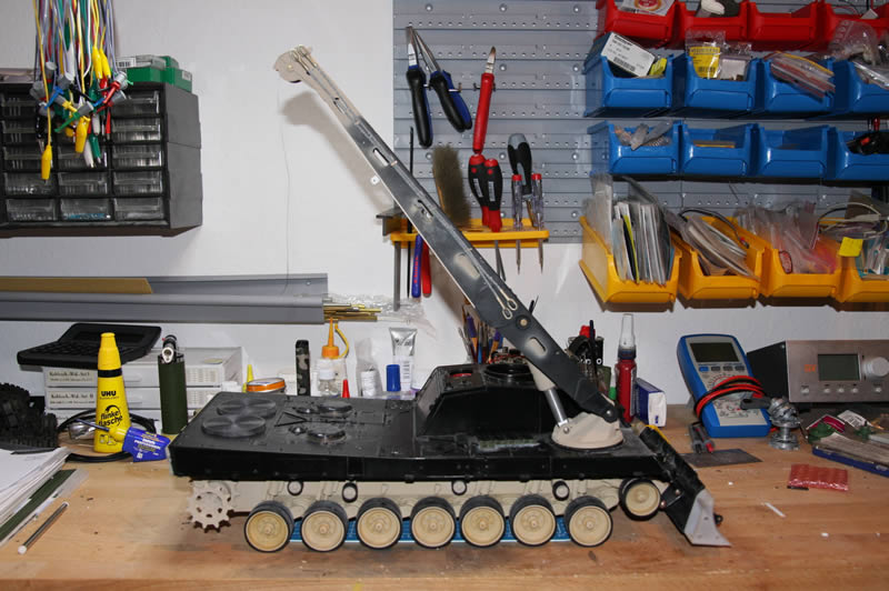 Die Lichtanlage hat mich auch auf Trab gehalten. Das Programm lief natürlich nicht sofort (DAS wäre ja auch ein Wunder gewesen! ), was ziemlich viel Zeit gefressen hat. Dafür sieht das jetzt richtig schick aus: Nicht das harte An-/aus von LEDs, sondern das etwas weichere auf- und abglimmen von normalen Glühbirnen. Das alles für die Blinker, Brems- und Tarnbremslicht. Außerdem wird die Endlage der Gefechtsfeldbergeeinrichung überwacht, sobald die Abschleppschere in der oberen Transportstellung angekommen ist. Spart mir einen Haufen zus. Platinen, Bauteile und Platz.