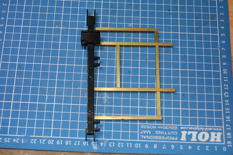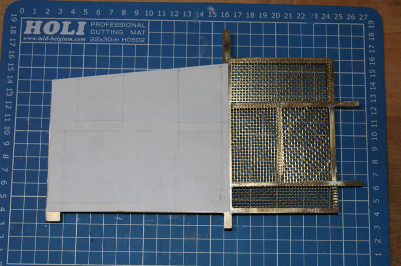 So soll das Ganze am Ende in etwa aussehen. Vorne kommt eine Abdeckplatte drauf (die Ausbrüche sind bis auf einen schon eingezeichnet), hinten etwas Gitter. Hier kann man auch sehen, dass oben noch ein Träger fehlt. Der kann aber erst rankommen, wenn ich die vorderen Aufnahmen des Trägers zum Fahrzeug habe.