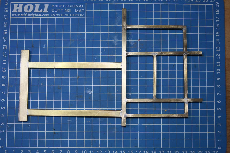Den breiten Träger vorne sowie den langen Querträger habe ich aus zwei L-Profilen zusammengebratet, der Rest sind Hohl- und Massivprofile. Das Ganze ist ein Hauch schief. Vorne noch sehr sauber und gerade, ist es hinten etwas schief geworden. Ist ein Tribut an meine bescheidene Werkstatt(-ausrüstung). Wird man später aber faktisch nicht sehen.