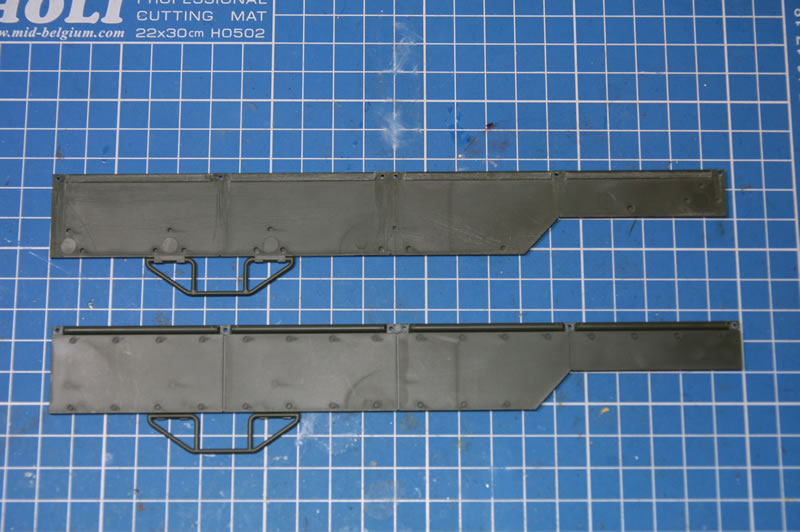 Die beiden bearbeiteten Schürzen für hinten. Die Montagehilfen mussten weg, die Schraubenköpfe ebenfalls.