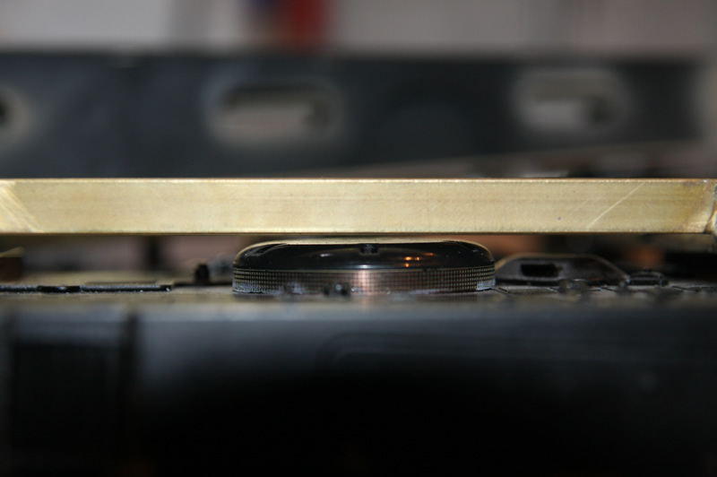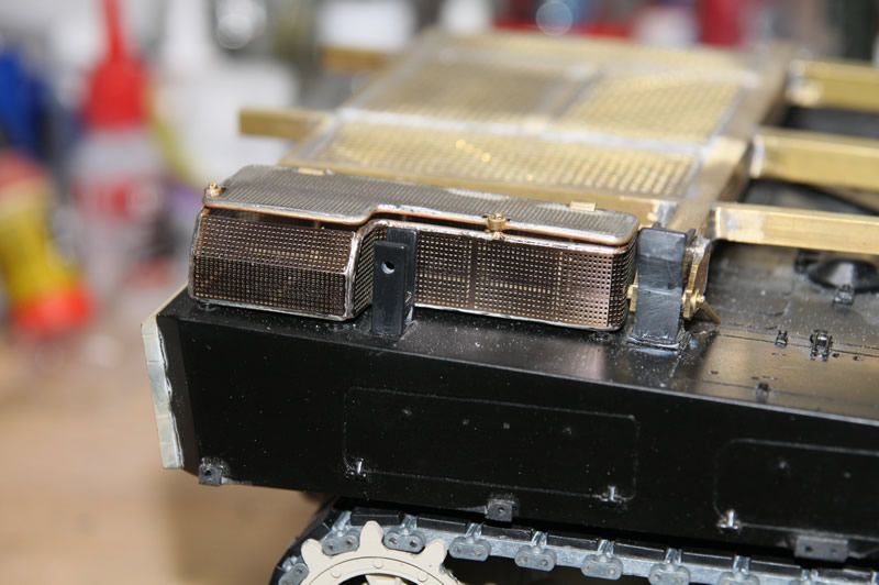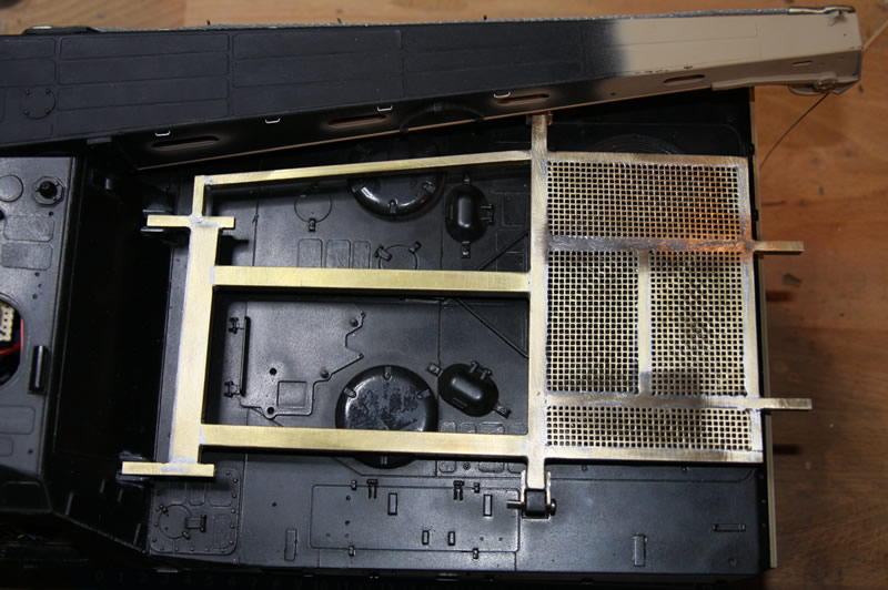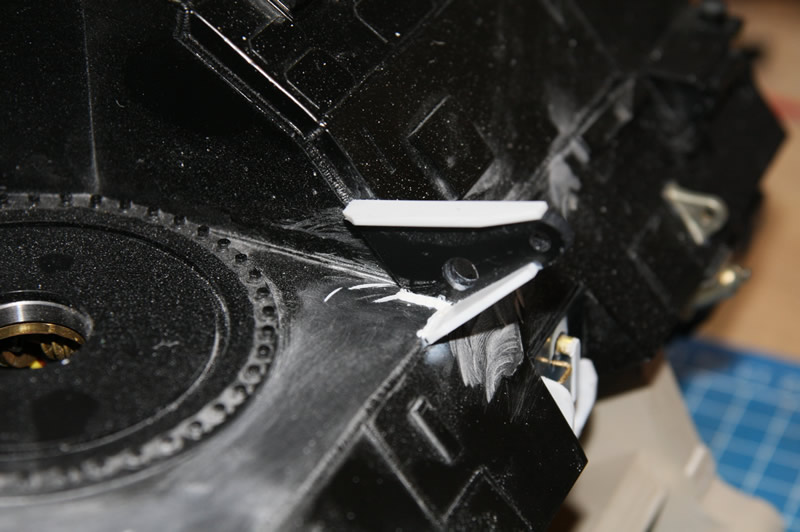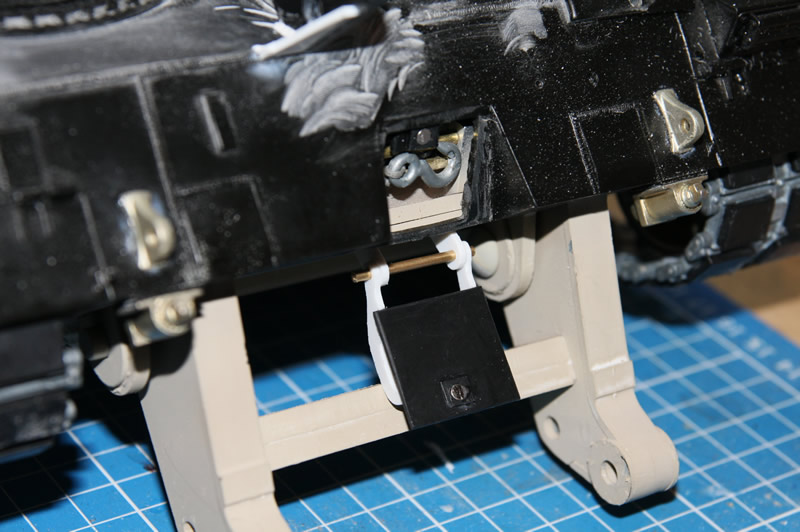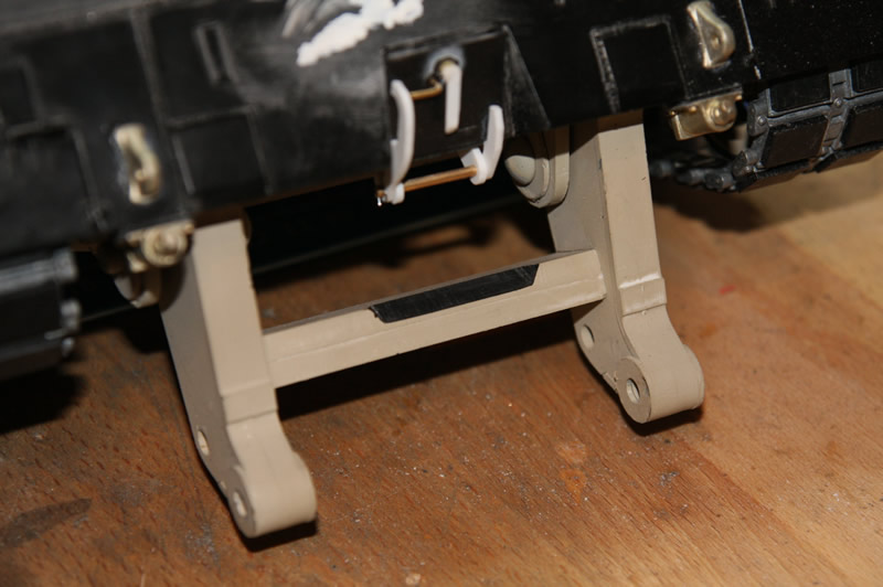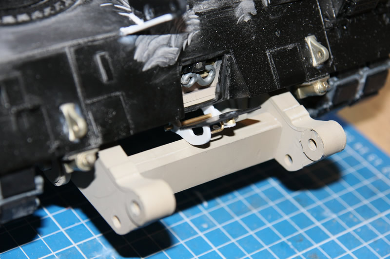 Die Klappe der Bergewinde und die Verriegelung des Räumschilds. Durch die Zusatzpanzerung musste sie unter die Wanne wandern. Damit die Klappe an ihrem Platz bleibt, habe ich da zwei kleine Magneten mit eingebaut. Die Stange wird noch etwas gekürzt und mit zwei Splinten gesichert. Außerdem muss die Querstrebe zwischen den Räumschildarmen noch etwas bearbeitet werden, sonst kann die Klappe gequetscht werden, wenn sich das Schild in der oberen Endlage befindet. Ist aber auch beim Original so.