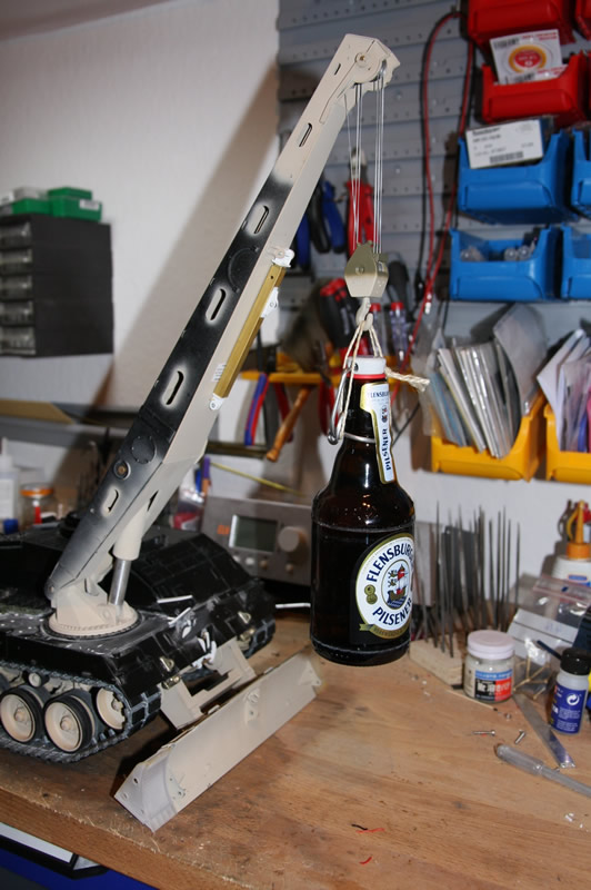 Hab den Burschen gestern mal auf seine Ketten gestellt, damit er mir nicht immer so unmotiviert über den Tisch rollt. Außerdem hab ich die Seilflasche des Krans aufgezogen. Und mit jedem Baufortschritt wird er schwerer und schwerer und schwerer...
