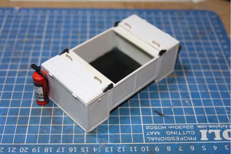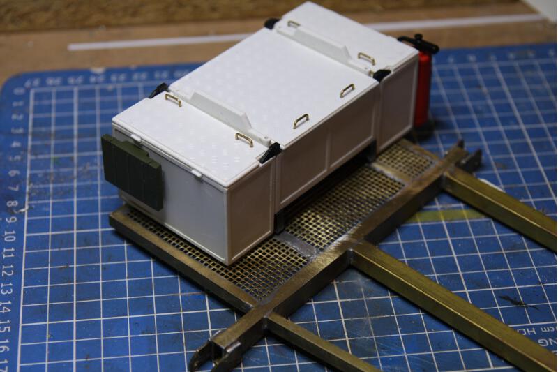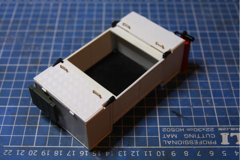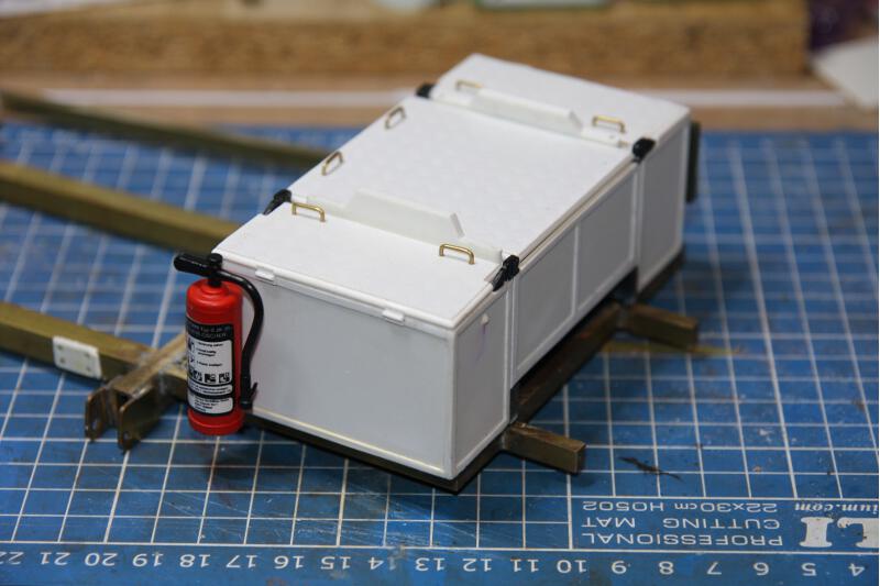 Als nächstes habe ich mit der hinteren großen Ausrüstungskiste gekümmert. In der Realität handelt es sich eigentlich um drei eigenständige Kisten, die ineinandergehängt werden. Ich habe vom TOM allerdings einen Prototyp seiner Kiste bekommen, was mir die Sache enorm erleichterte. So konnte ich zumindest sicher sein, dass die Hauptabmessungen ziemlich gut stimmen.