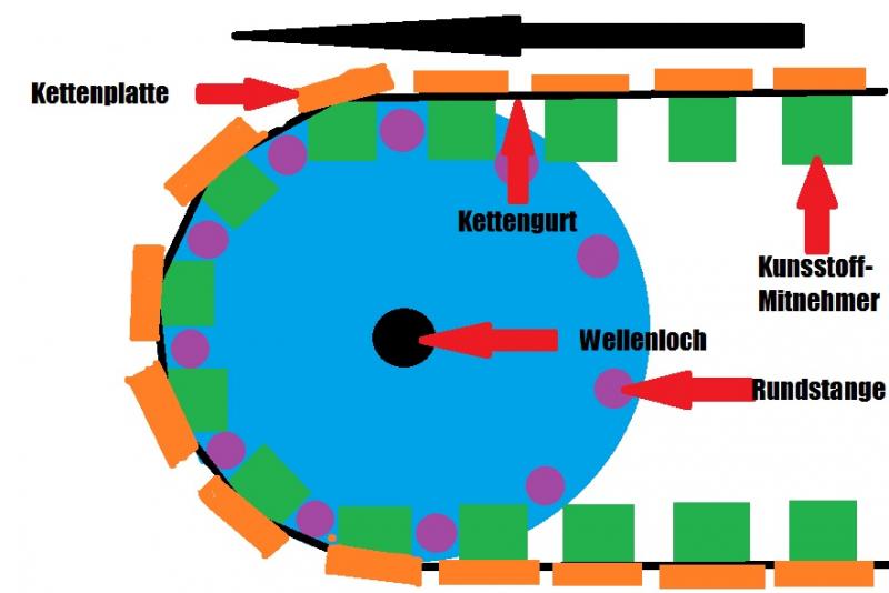 Ein Antriebs- bzw Kettenrad bestehe so aus jeweils 2 Runden Aluminium-Scheiben, in die jeweils am Rand ringsherum in immer gleichen Abständen ein Loch nach dem anderen gebohrt wird. In dieses Loch würden dann passende Rundstäbe eingesetzt, die später eine Kraftschlüssige Verbindung zwischen Kettenrad und Kette herstellen sollen. Hierzu würde auf jede Kettenplatte ein entsprechendes Kunststoffstück montiert, welches dann zwischen jeweils zwei Rundstangen des Kettenrades greift und so mitgezogen wird. Um beide Scheiben verdrehsicher zu verbinden wäre ein im Außendurchmesser 50mm messendes Alumium-Rohr als Mittelstück/ Abstandshalter vorgesehen.
