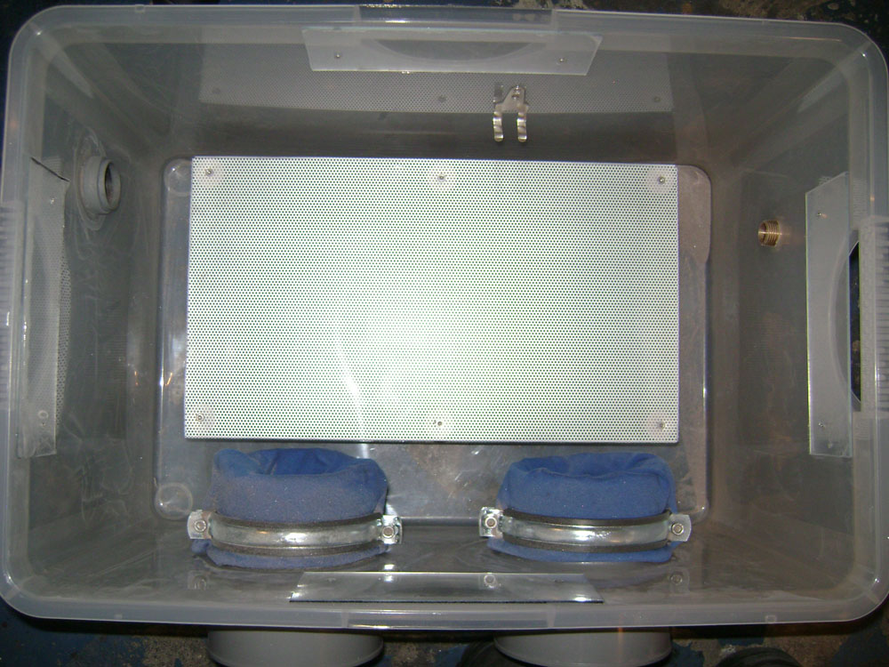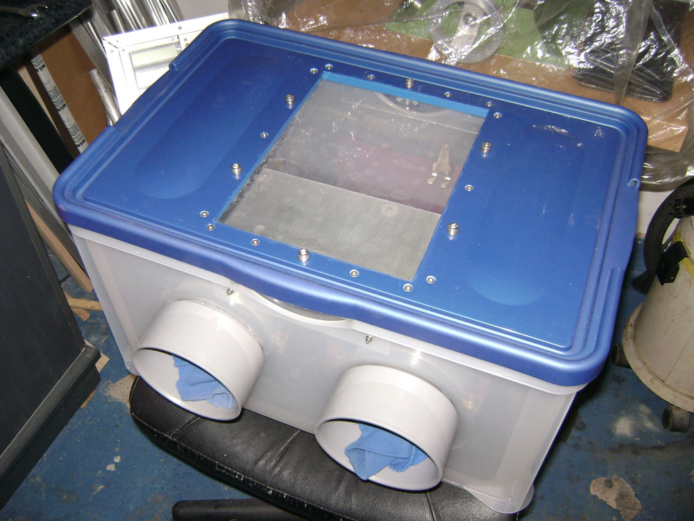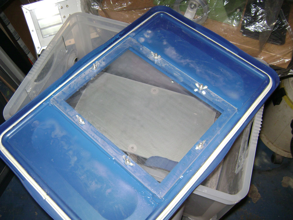 Den Deckel habe ich deshalb auch mit Dichtband für Fenster abgedichtet, er saugt sich durch denn Unterdruck in der Kabine auf dem Rand der Kiste fest.