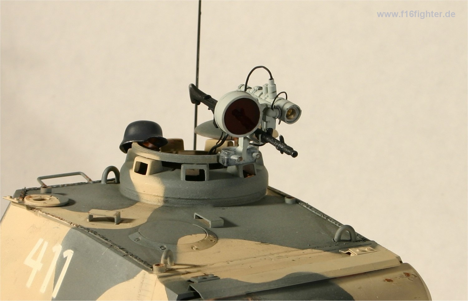 das Teil hat noch einmal 3 Abende Arbeit gemacht (vor allem die Messungen - mir liegen leider nur 1:35-Skizzen vor). Nun wird das Bauteil noch lackiert, dann ist der Bau endgültig abgeschlossen (die Regenrinne am Fernrohr und das Rücklicht sind nur noch Kleinigkeiten).