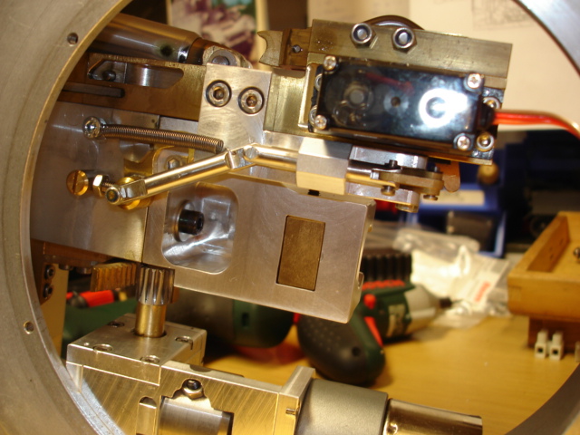 Der Kulissenschlitten saust mit dem Bodenstück zurück und rollt mit dem kleinen Kugellager an dem Radius entlang wird dadurch nach aussen gedrückt. So gibt er in der hinteren Endlage die BK wiederrum frei die dann mittels einer Feder, die im Mantelrohr eingebaut ist, wieder nach vorn gedrückt wird. Ebenfalls im Mantelrohr ist eine Gummimembran eingebaut die die Vorlaufbewegung (durch Kolbenwirkung) bremsen soll. Aber wie schon gesagt das braucht noch etwas Abstimmung.