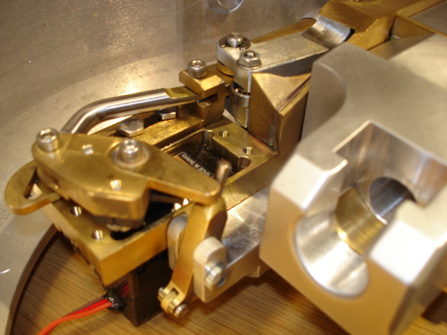 Das erste Foto zeigt die Gesamtansicht von oben. Zu sehen ist die Stellung "Fertiggeladen", d.h. der Federzylinder wurde vom Servo über den gebogenen Spannhebel zusammen gedrückt und der Laufschlitten in der Kulissenführung rastet an einer Stufe am Bodenstück der BK ein.