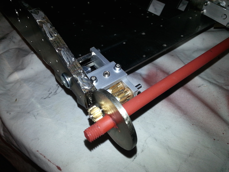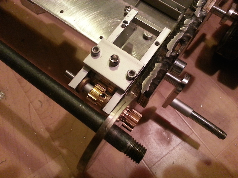 Hier der Prototyp des Kettenspanners. Die Idee ist, mit einem Schneckenantrieb über eine platzsparende Übersetzung bis zum Innenzahnkranz der Spannrollenaufnahme zu kommen. Das Getriebe wird dazu innen an der Wanne befestigt. Es ist eine Übersetzung notwendig um in den Wannenbereich zu kommen, bei dem bei mir ausreichend Platz zur Verfügung steht.