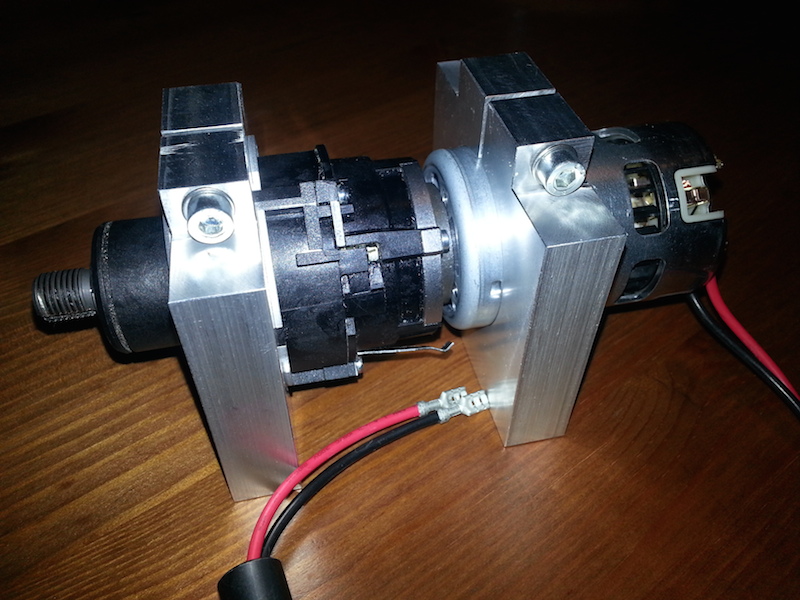 Hier die nach langen (Unter)suchen gewählte Antriebslösung: 2-Gang-Planetengetriebe und DC-Motor aus einem Akkuschrauber. Wird dann noch per Zahnkranz/Kette auf die Antriebswelle untersetzt. Die Rutschkupplung kommt auch wieder drauf. -- Grüße, Kay