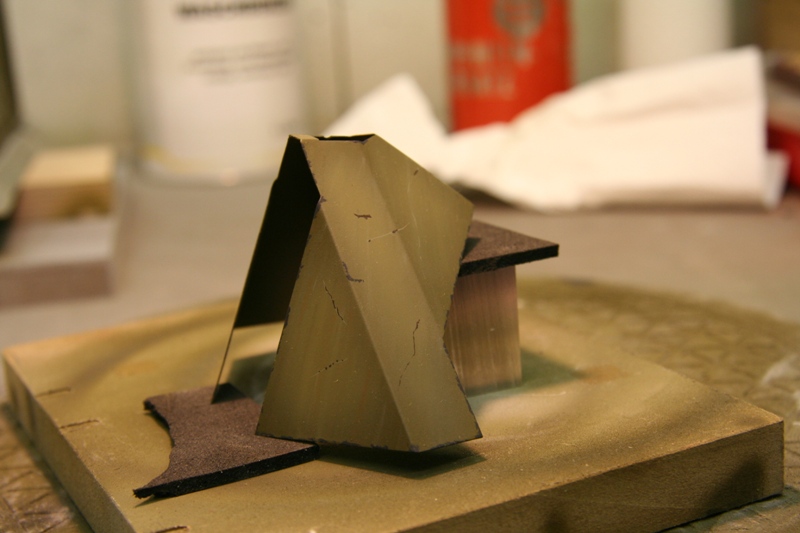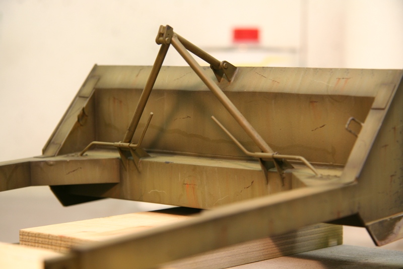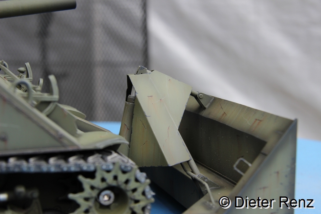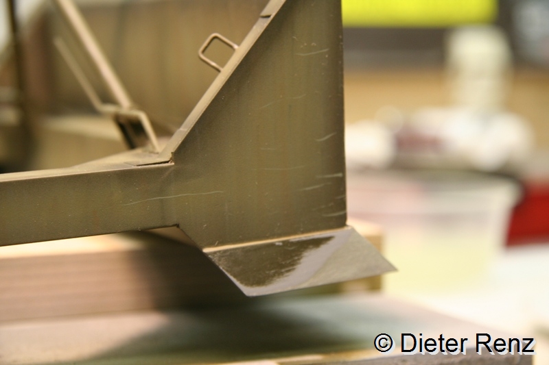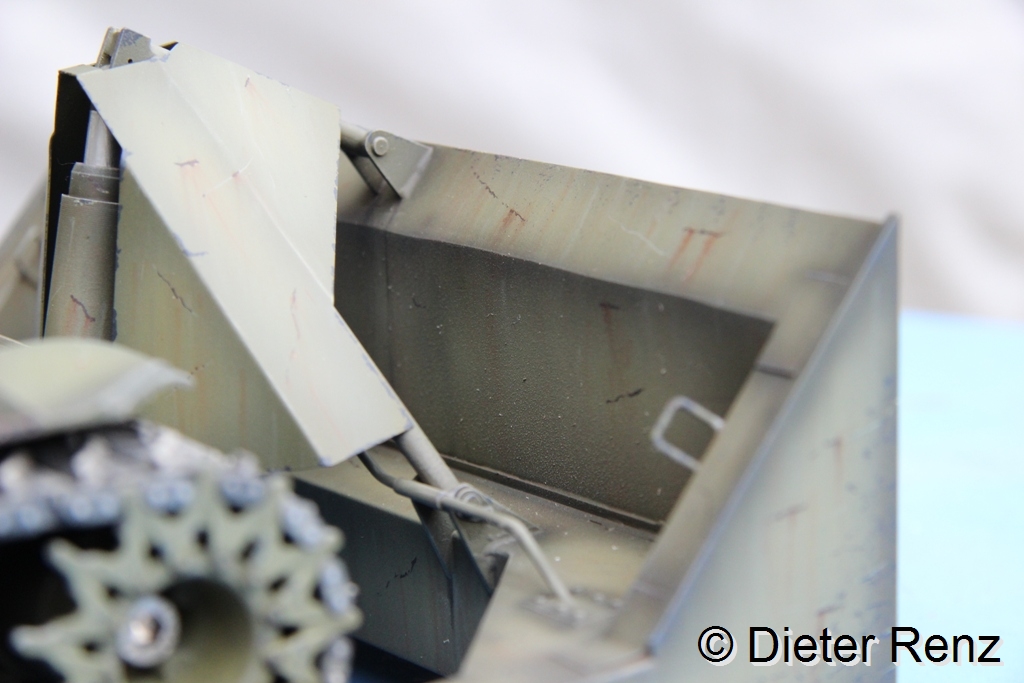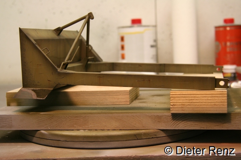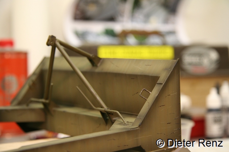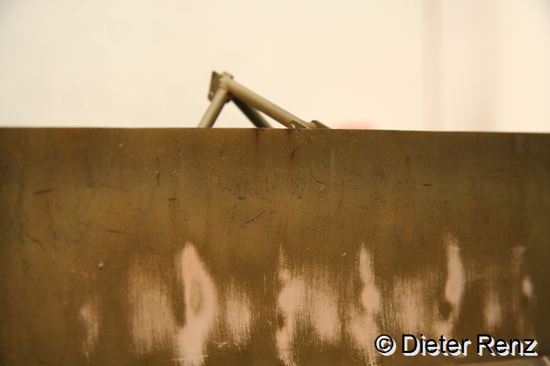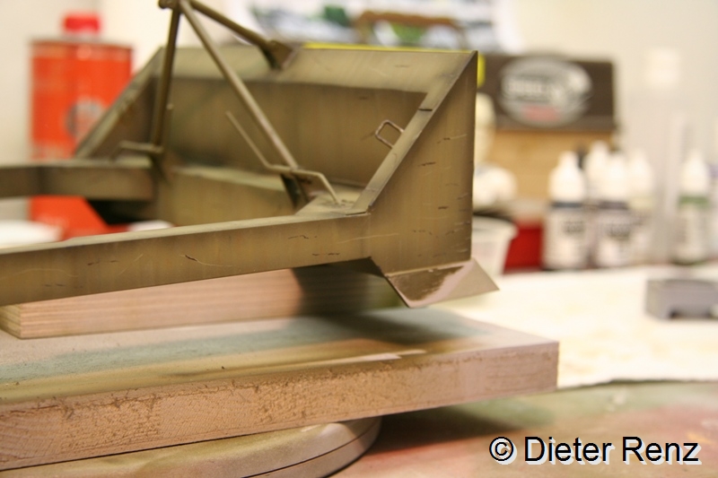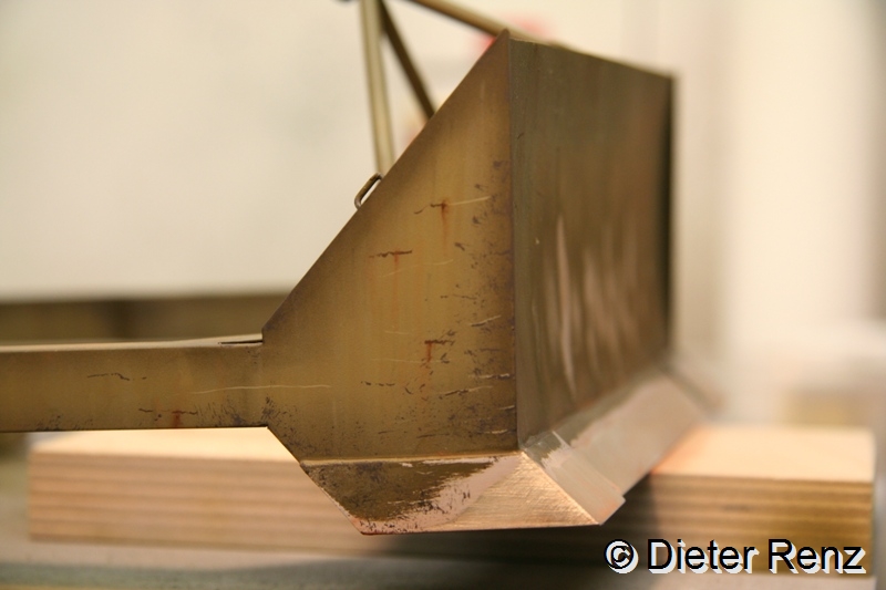 Jetzt hab ich die tiefen Lackabplatzer imitiert, dazu verwende ich die Farben German Grey und Schwarzbraun von Vallejo, man sollte dazu den Pinsel möglichst im rechten Winkel zum Untergrund halten und mit ungleichmäßigem druck über dir Fläche führen. Leichtes Zittern ist bei der Arbeit von Vorteil. Hier mal das Ergebnis