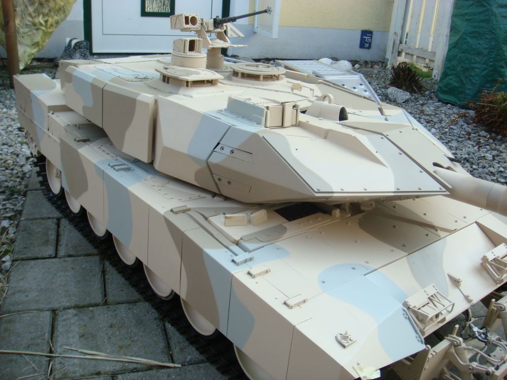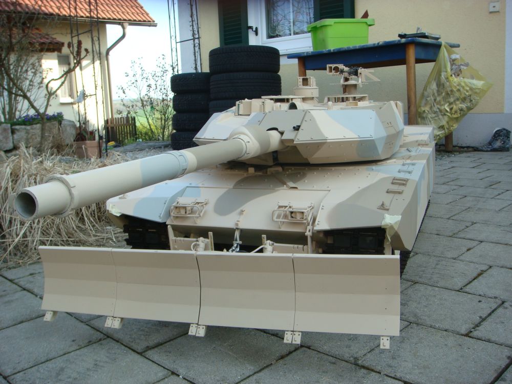 Zur Zeit baue ich einen Leopard 2A7+. Basis dafür war ein Bigtanks Leopard 2. Dieser wurde mehr oder weniger aufwendig umgebaut. Inzwischen hat dieser eine Stahlwanne, neue Lager, Stossdämpfer, neue Kettenbolzen- und endverbinder, neue Zahnkränze, neuer Drehkranz für den Turm, neue Lagerung der Kanone, SGS Regler, Benedini Soundmodul, Hydraulik für das Räumschild, Lichtanlage, neue Zusatzpanzerung, neue Luken, neues Periskop, Waffenanlage auf dem Turm, etc.... Habe schon einiges verändert