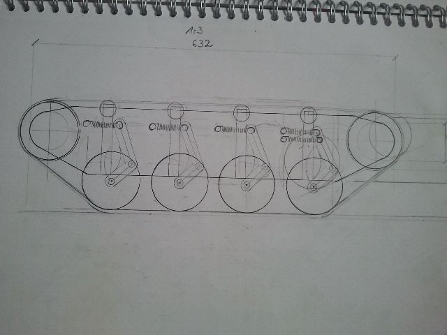 Das war der Zeitpunkt an dem ich nochmal alles zusammengeworfen habe und hier im Forum zu lesen. Da ich eigentlich keinen Panzer wollte aber von klein auf auf das geschmeidige Abfedern eines modernen Panzers stehe, wurden die Entwürfe immer panzerähnlicher (da half auch ein gewises Forum). Seltsamerweise habe ich die Schrägen etc nicht abgenommen sondern am Einfederverhalten der Laufrollen ausgemessen und schon sah die Wannenform Panzertypisch aus.