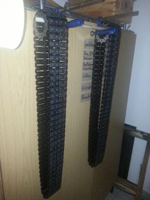 Die fertige Kette ist 83 mm breit. Inwzischen wurde ein passendes Kettenrad gelasert.