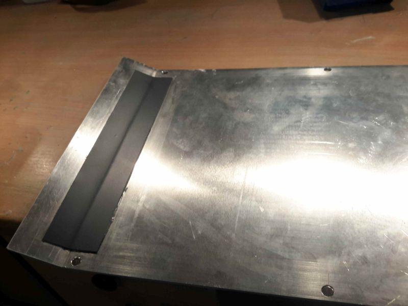 Ich habe dann von innen noch eine 1 mm Aluplatte gebogen und geendfestet. Hält sehr gut. Noch etwas Spachtelmasse für die Ränder und es fällt nichts auf.