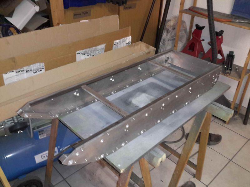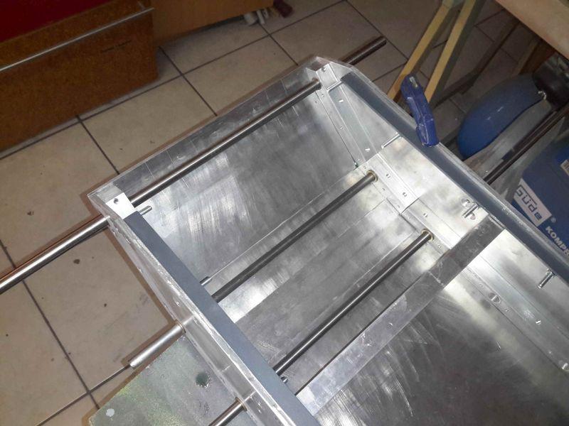 Der 3 mm Aludeckel lies sich natürlich nicht biegen. Der brach fast sofort. Also ein 1mm Stahlblech gebogen und auf-geendfestet. Erstaunlich wie gut das Zeug hält.