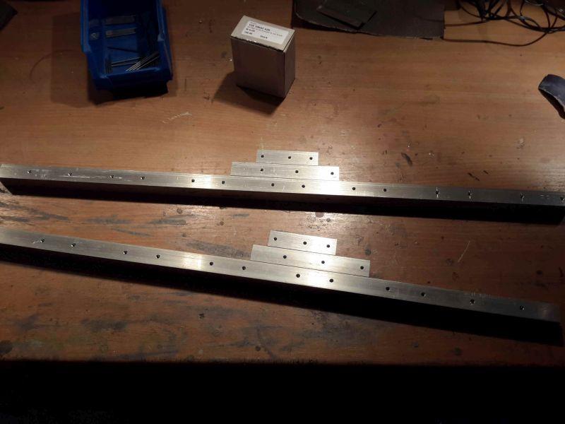 Aus 20x20 Alu Vierkant wurden die Verschraubungen abgelängt und geborht die später auch die Buchsen für die Schwingarme aufnehmen sollen.