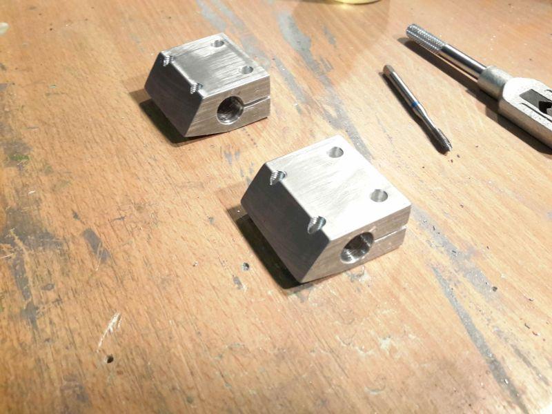 Sind 20x20mm Vierkant abgelängt, leicht zulaufend gefeilt, 2 m5er Gewinde hinten zum befestigen und eine 4,97mm Presspassung vorne um die 5mm Silberstahlwelle einzupressen. Auf ein Verstiften habe ich hier verzichtet. Ich denke nicht das es an der Stellt genug seitliche Kräfte gibt damit die Welle sich losmacht.