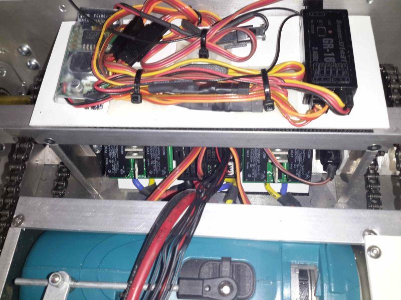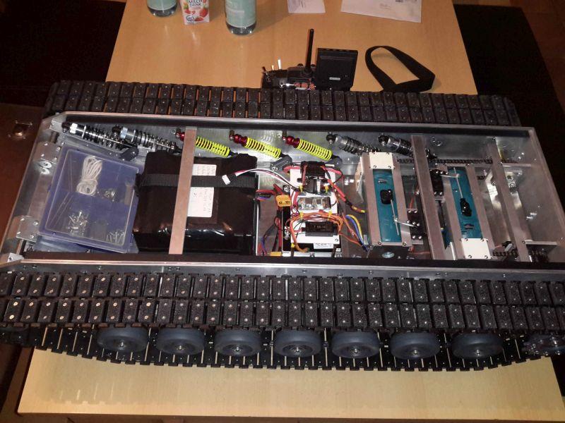Ich habe aus dem aktiven Antriebsradumfang und den per Telemtrie ermittelten RPM im ersten Gang 4,95 km/h und im zeiten Gang 13 km/h errechnet. Wohlgemerkt ich lasse den Regler nur 80% der Leistung auf die Ketten bringen beim geradeausfahren. Der Mischer ist im Regler dabei und er kam mir am sinnvollsten vor da man so noch Reserven hat um bei voller Fahrt zu lenken.