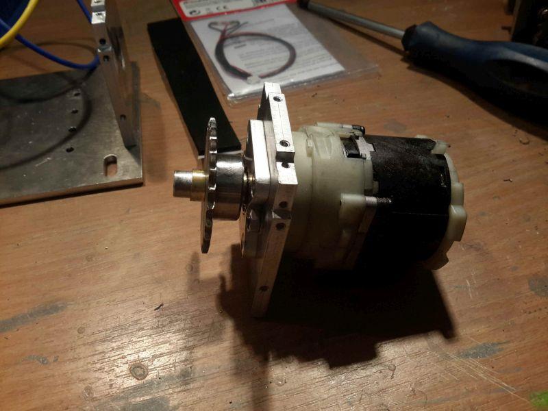 Die 2 Akkuschrauber Motoren wurden zerlegt und auf die Getriebewelle die Kettenblätter geklebt und gestiftet. Das war Bohrer-fressend da diese Wellen gehärtet sind.