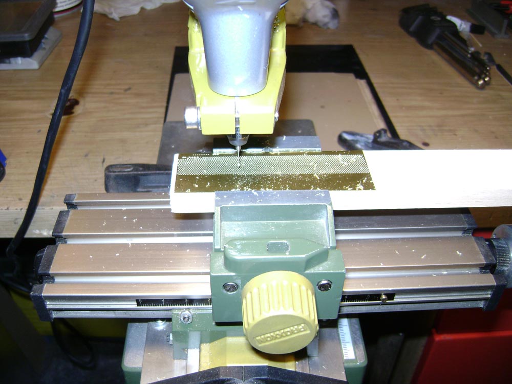 Mit Sekundenkleber benetzt, Blechstreifen drauf und verpresst und Voilà, sitzt ohne Luft auf dem Holz, was bei so dünnem Blech, hier 0,3 mm Messing, nötig ist, damit der Bohrer genug „Material“ hat.