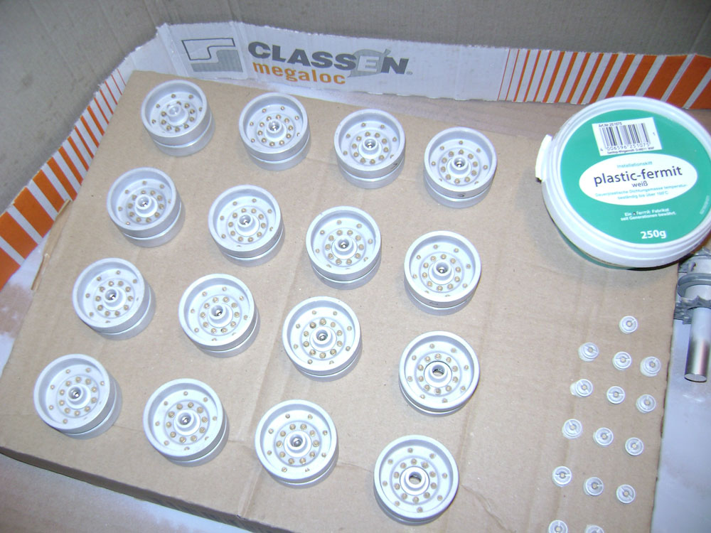 Die Nabenabdeckungen habe ich mit Plastic Fermit fixiert, damit sie nicht davon fliegen, während des Lackens.