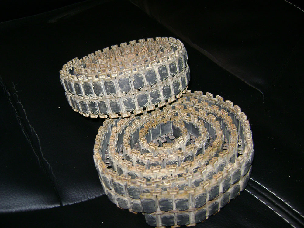 Nach dem Strahlen hatte ich die Kette mit Metallgrundierung Lackiert und die Kettenpolster aufgeklebt, mit schwarzem Sika Flex schwarz, damit werden normal Fugen verfüllt, aber da ich das noch daheim hatte, und wirklich klebt wie die Hölle hab ich das einfach mal versucht, und es hält… leider zu gut.. einige habe ich schief verklebt, aber jetzt ist alles im Lot.