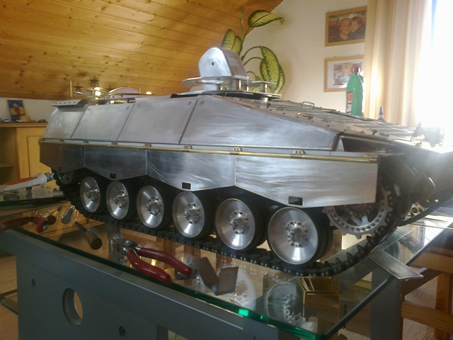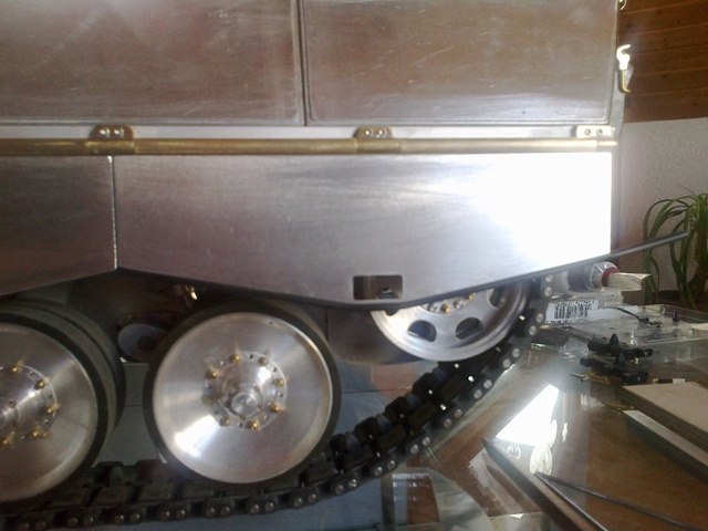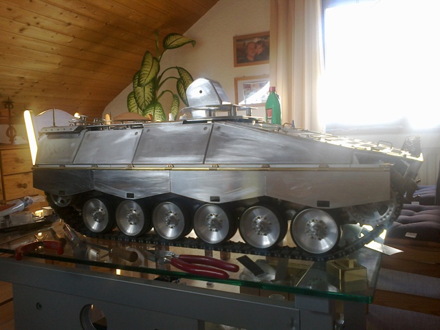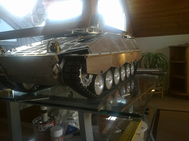 Die beiden Scheinwerfer sind montiert und die Kettenschürzen hat er jetzt auch bekommen, müssen natürlich noch die Details dran.