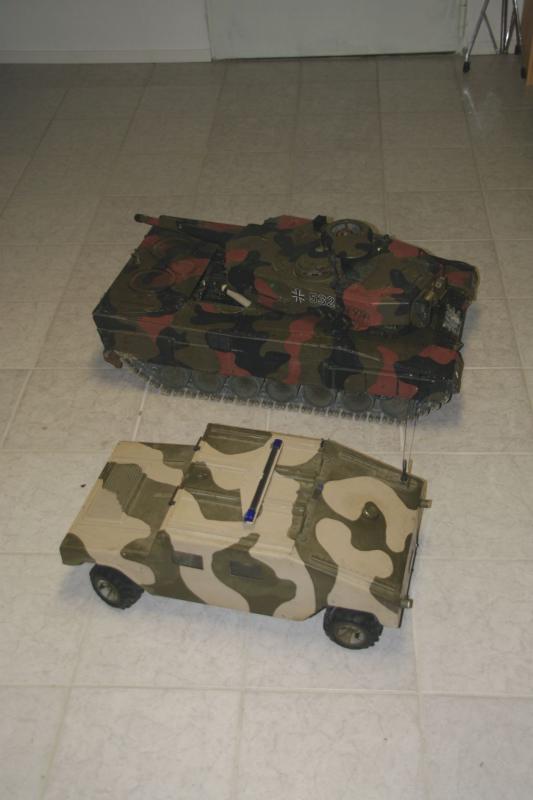 Wie berichtet hab ich ihn mir angeschaut und einfach gekauft, bevor es ein anderer tut. Der Panzer stammt aus einem Nachlass, der Leo wurde von einem älteren Mann gebaut und gefahren. Auf Anhieb konnte ich nicht viel erkennen., also Antrieb usw, aber dann habe ich das 50 kg Monster gekauft ( länge-940 mm. breite 480mm, höhe-340mm). Als Zugabe gab es noch den Humvee, ebenfalls mit Benzinantrieb und zwei Computersender, sowie noch einige Teile. .Zuhause hab ich ihn dann etwas zerlegt. Der Motor ist wohl von Stihl und springt sogar an. Das Getriebe ist versteckt und kaum zu erkennen. Soweit ich erste einmal sehe : Fliehkraftkupplung dann Zahnriemen und dann Stahlräder. Sogar der Turm wird vom Motor angetrieben. Auch eine 8mm Gaspistole ist verbaut das Rohr wird mit Servo bewegt, auch der Kommandant wird mit Servo hoch gefahren . Der Turm ist um 360 ° drehbar. In der Drehachse ist eine Drehkontaktwelle.