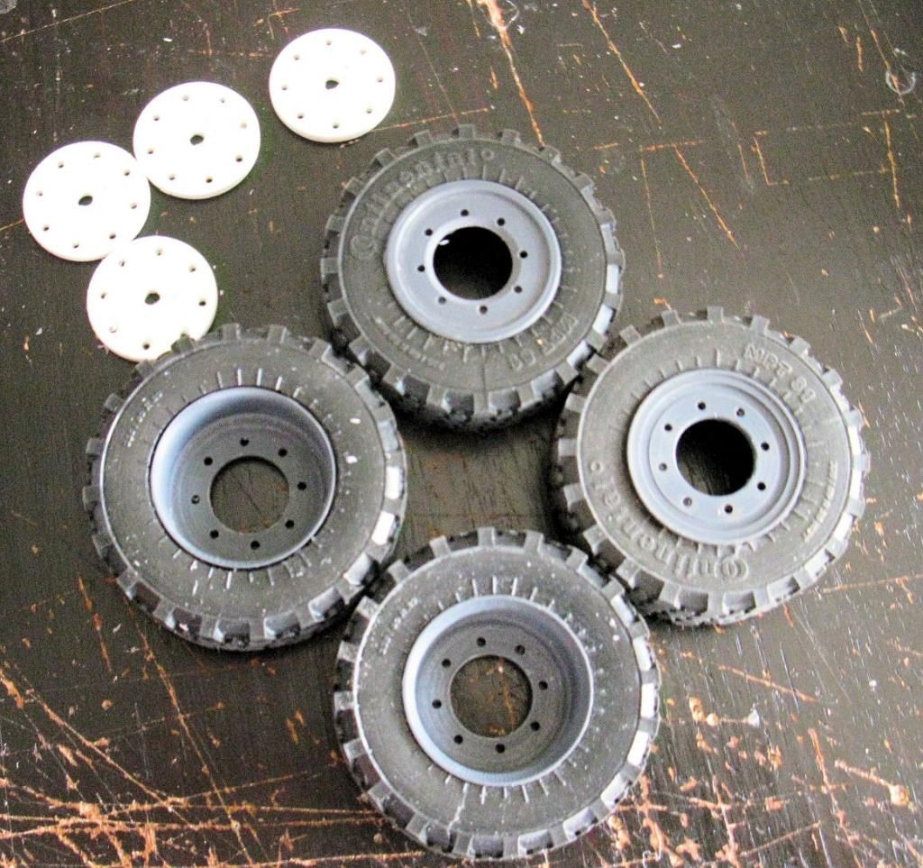 Mach ich jetzt mal mit den Kleinteilen weiter: die kleinen Scheiben werden aussen auf die Radmitnehmer geklebt, als Verstärkung. Alternativ geht auch eine passende Karosseriescheibe oder das Teil "VA-Nabe für Felge FE14012 und FE16005" von AFV (mit etwas Nacharbeit)