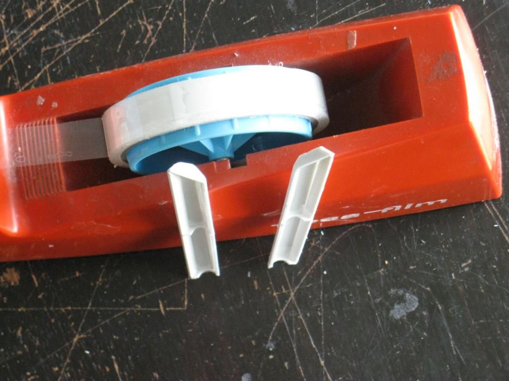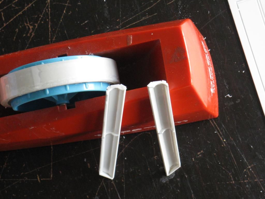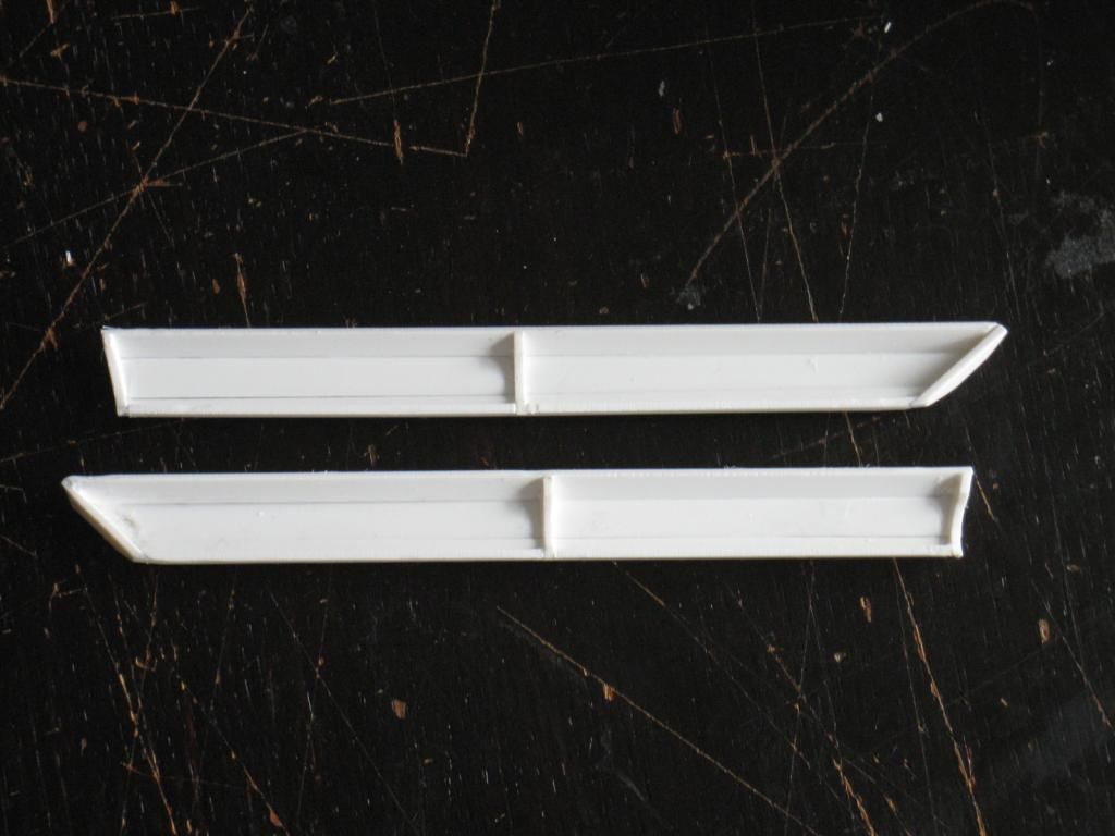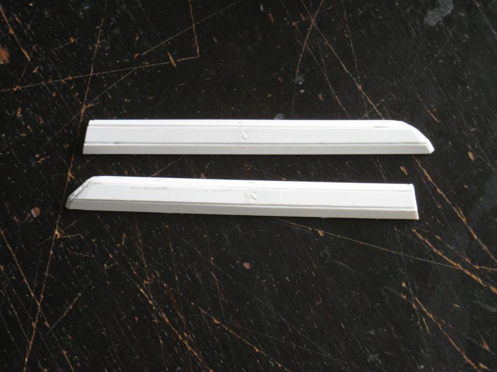 Kotflügelverbreiterungen aufeinandergeklebt, nach dem Aushärten des Kleber die Ecken gerundet, am Modell befestigt
