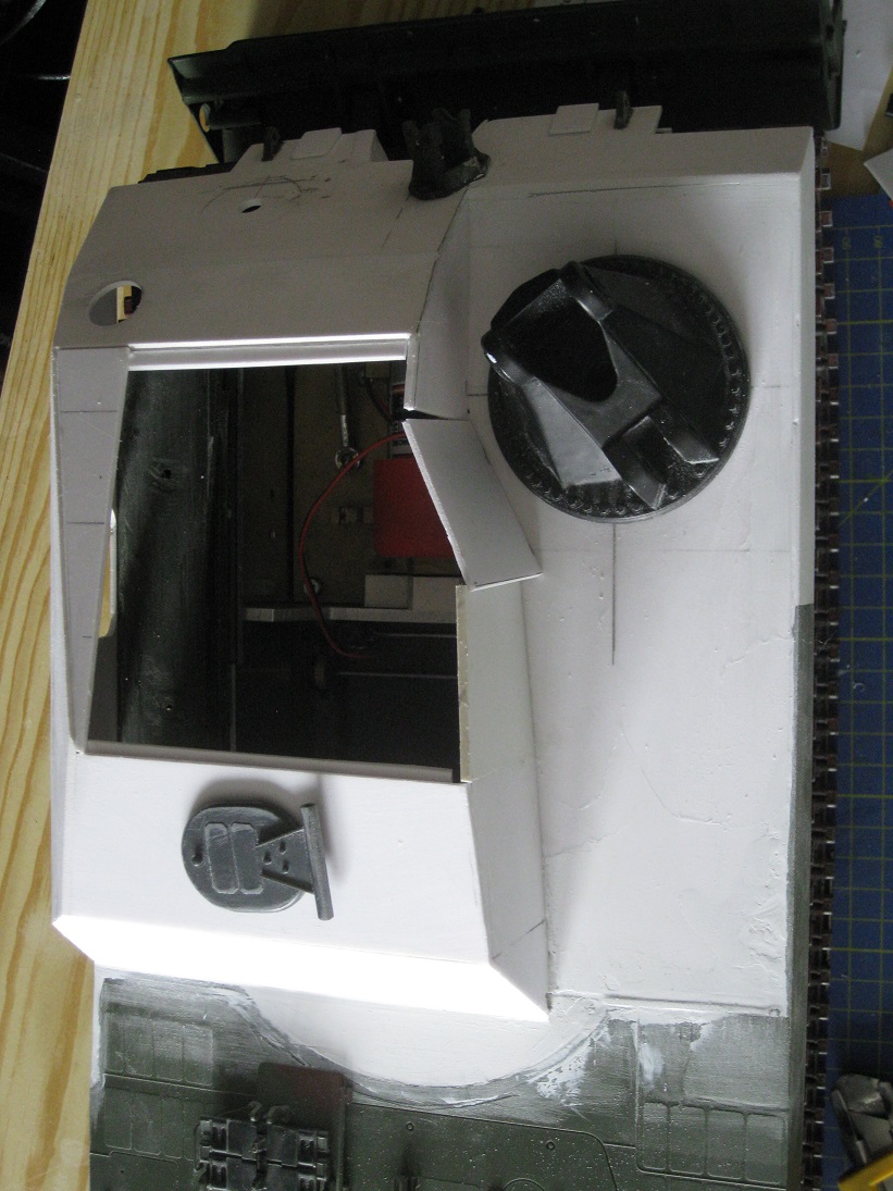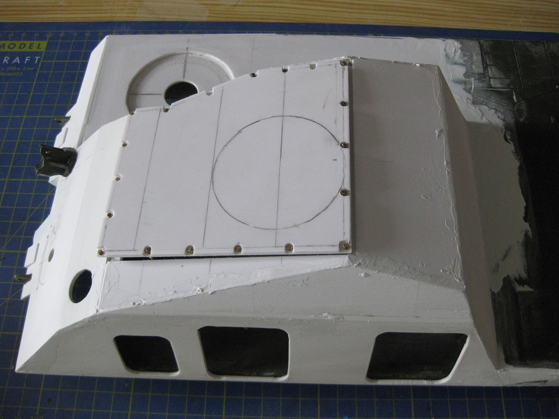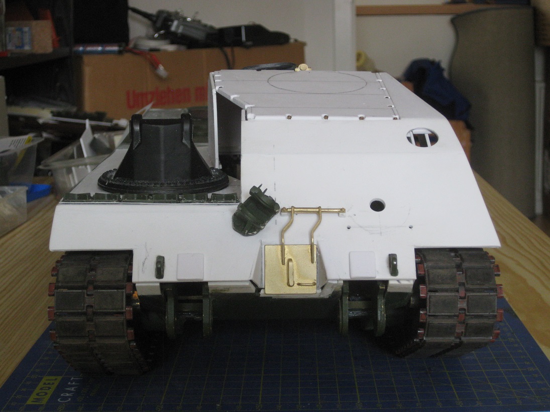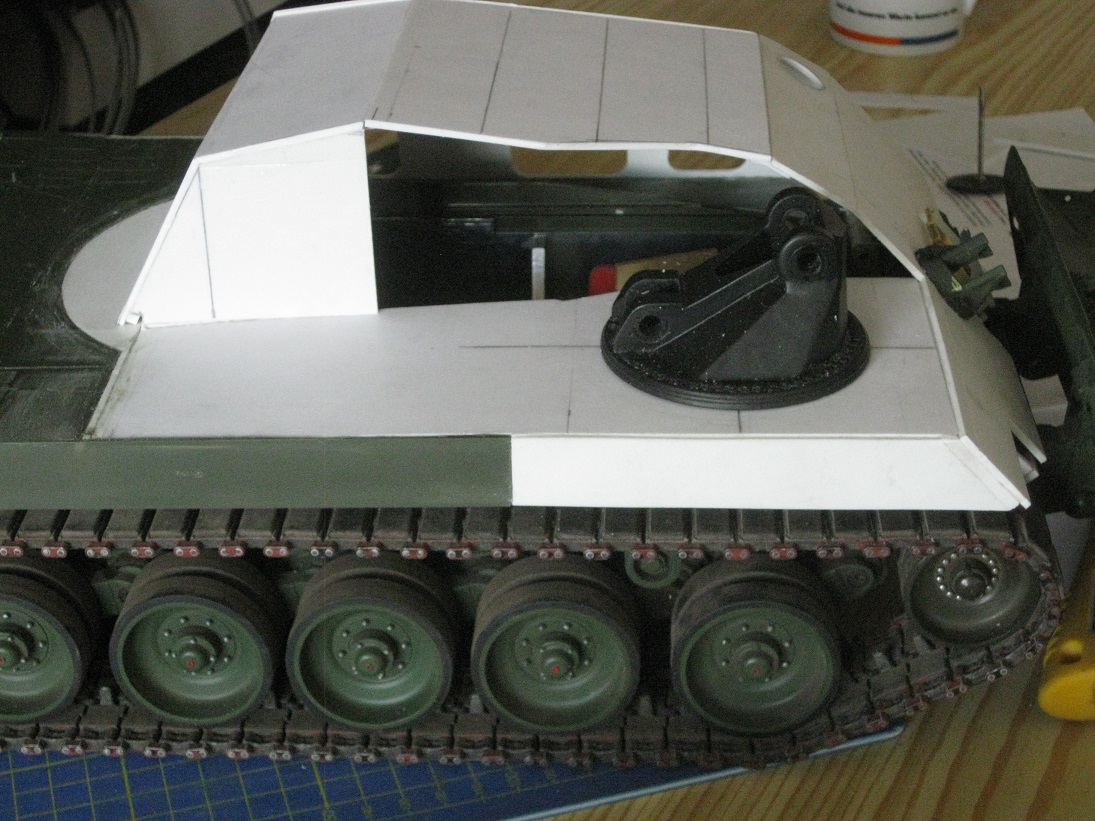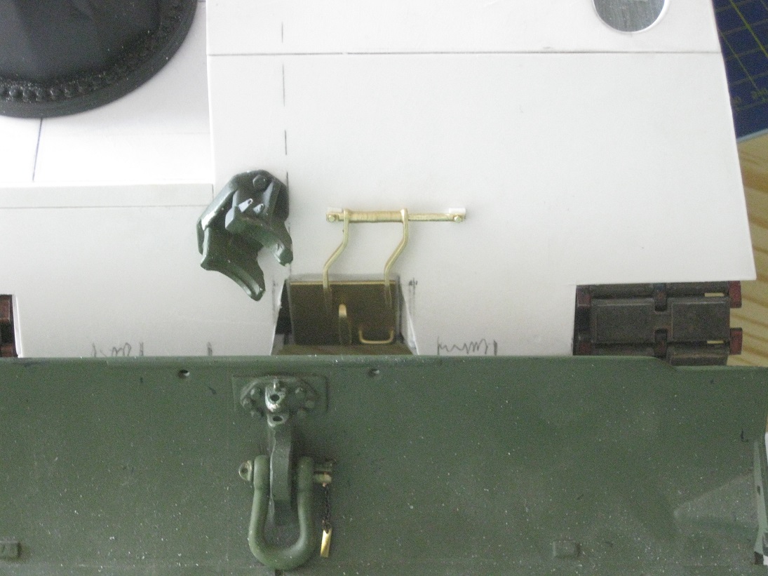 Die Form und Maße der "Hütte" scheinen zu stimmen. Das zeigen Proben mit dem Kran (flach liegend guckt das Dach drüber) und dem AFV- Motorträger (Querbalken endet vor den Lüftern). Leider sitzt meine Klappe für das vordere Bergeseil ca. 7mm zu weit links. Da hab ichs mit dem aussermittigen wohl zu gut gemeint. Hier passen die Proportionen/ Abstände nicht zu der großen Umlenkhalterung. Das fehlt zwar schwer, sich das einzugestehen aber ich möchte mich nicht später über Pfusch ärgern. Also versetzen..... (später....)