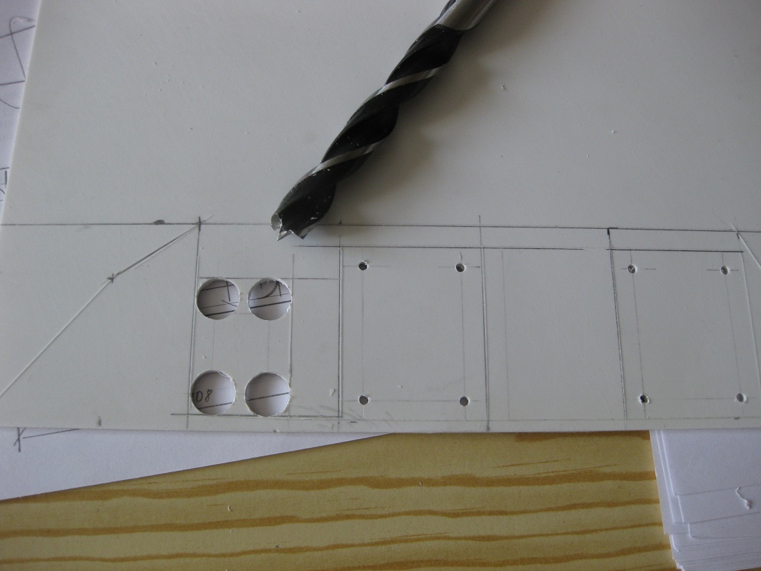 Heute hab ich die Seitenwand in Poly geschnitten (keine Fräse!). Dazu die Radien für die Türen mit einem Bohrer- von Hand! - da sonst die dünnen Stege nach unten gebrochen wären.