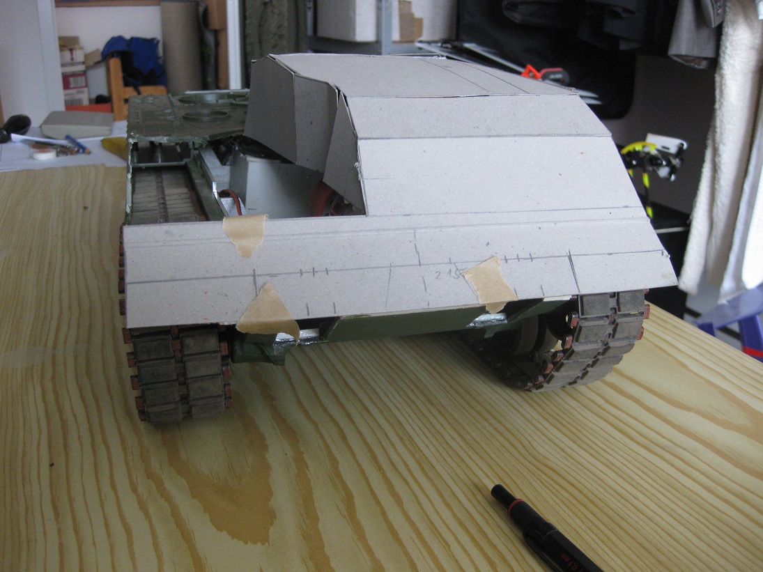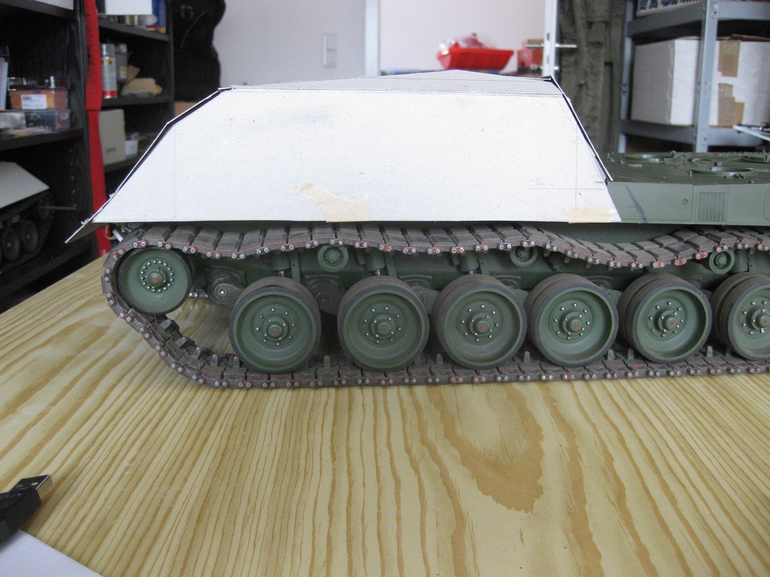Nach längerer Abstinenz möchte (kann) ich mich wieder dem Modellbau widmen. Ich habe lange überlegt, was ich machen möchte. Resultat ist ein BPZ \\\"Büffel\\\" auf Basis des Tamiya Leo 2 in 1:16. Ja, nicht mein erster. Aber durch die Verfügbarkeit toller Komponenten der Fa. AFV ist es mittlerweile möglich, ein vor allem funktionell wesentlich besseres Modell zu bauen. Ich habe gleich überlegt, den AFV Büffel/ das Oberteil zu kaufen, aber das ging mir gegen die \\\"Modellbauehre\\\". So begann ich wie immer anhand von Plänen Skizzen und Zeichnungen zu machen. Danach folgte ein Papp- Prototyp der \\\"Hütte\\\". Zum anprobieren auch gleich das abschneiden der Tamiya Oberwanne.
