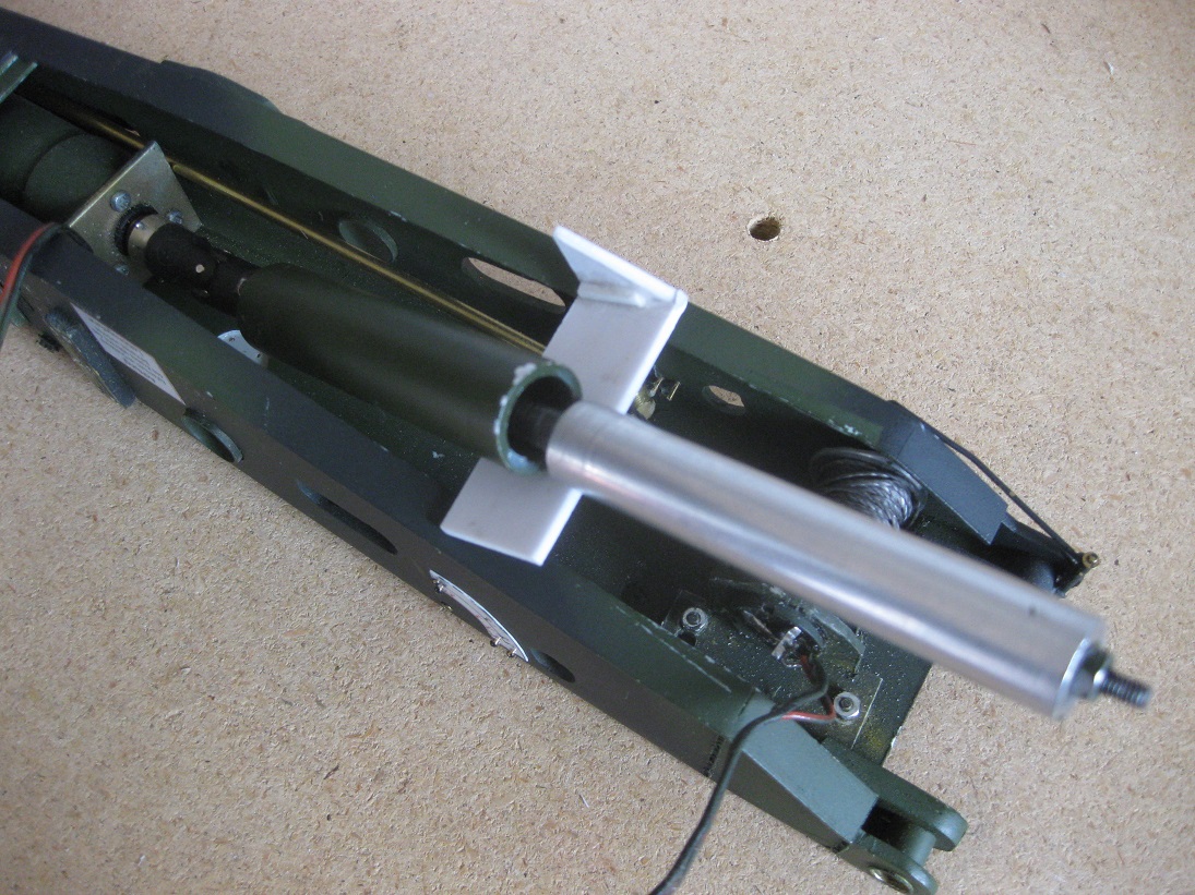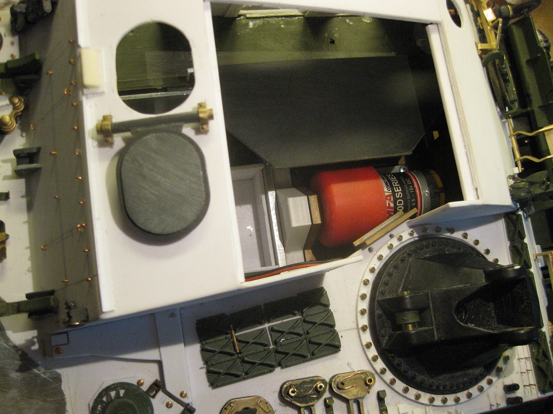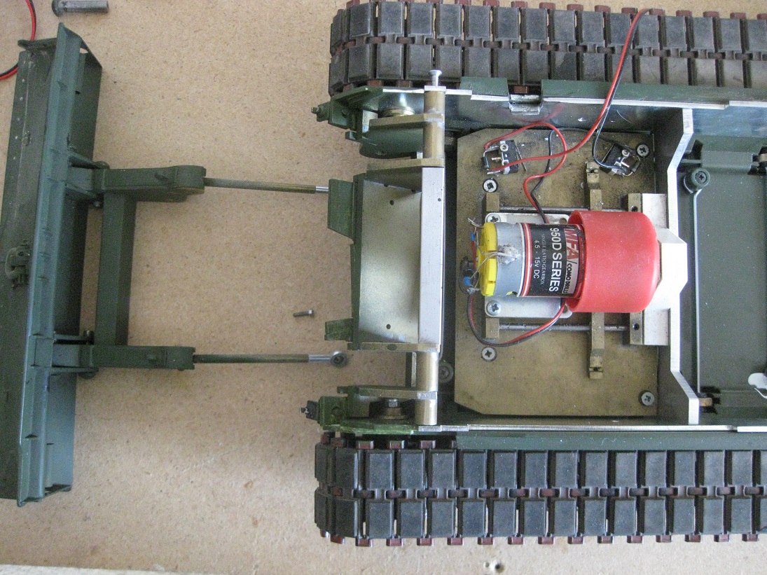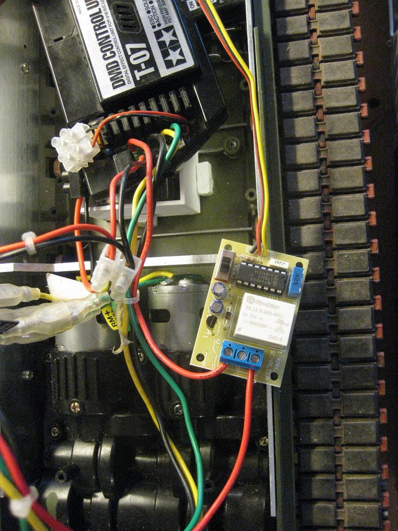Heute kamen die AFV- Komponenten in den Kranarm. Der Hubzylinder mit dem innenliegenden Motor ist schon klasse! Danach die Aufteilung des Platzes für DMD und Akku. Den Akku hab ich über die Drehstäbe in eine nach oben offene Box platziert. So kann er leicht von oben durch das abnehmbare Dach der Kasematte gewechslet werden. Die DMD kommt auf die schwarze Platte (Foto 3). Inspiriert von Thomas W. habe ich eine Funktion integriert, die es ermöglicht, den Motor "hochdrehen" zu lassen auch wenn der Panzer steht. Hierzu wurde ein Relais in die Motorleitung geklemmt. So kann der Fahrmotor vom Strom getrennt werden und das Soundmodul suggeriert trotzdem "GAS".