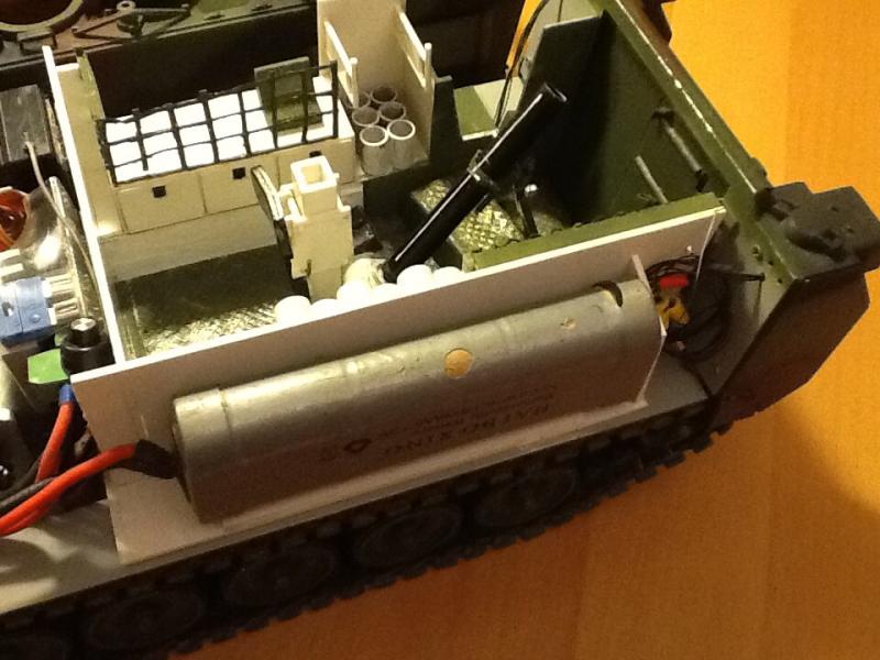 Wenn der Kleine die externen Tanks hat, dann würde ich die Akkus dort unterbringen. Pro Tank einfach 3 AA Akkus, die sind ein wunderbares Gegengewicht zu den Getrieben vorne in der Wanne.