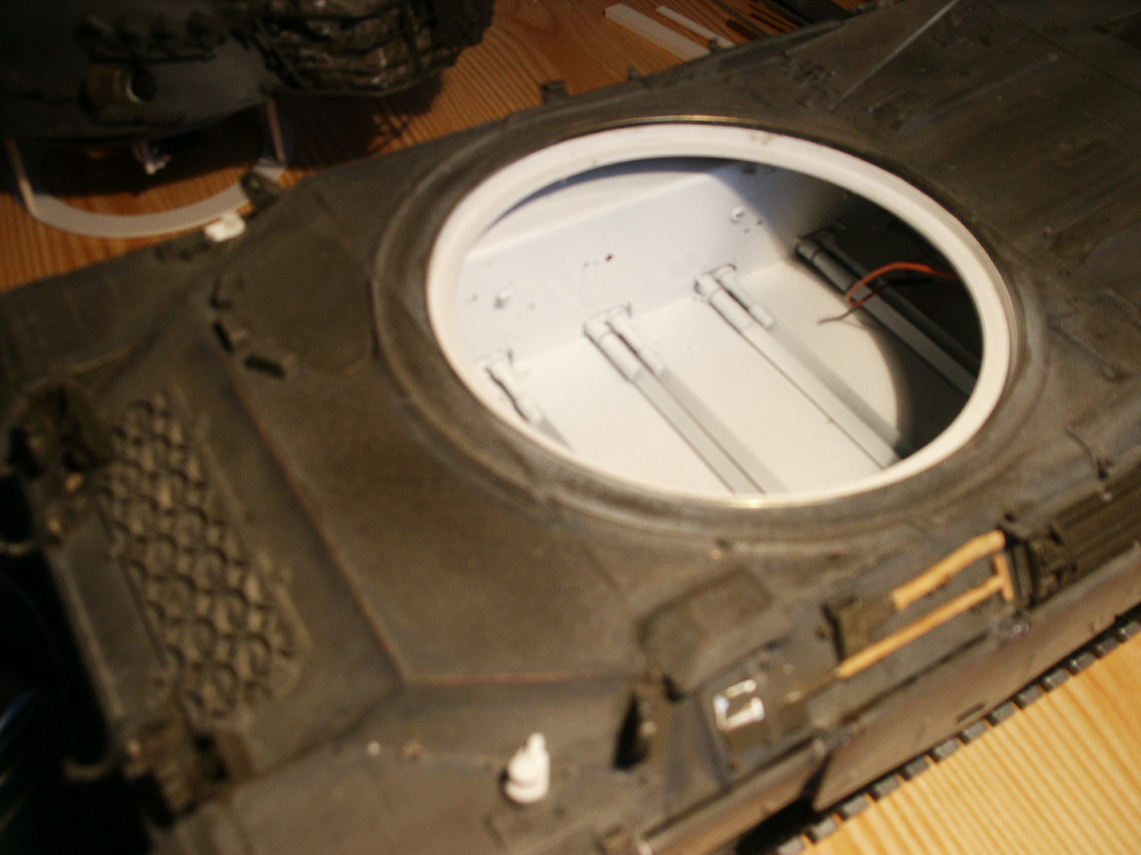 Im Heck des Turm´s sitzt ein 7,4 V 850 / mAh Lipo Akku für die Turmelektrik und der Empfänger für den Turm sitzt an der Stelle,wo beim Original die Turmhydraulik sitzt.