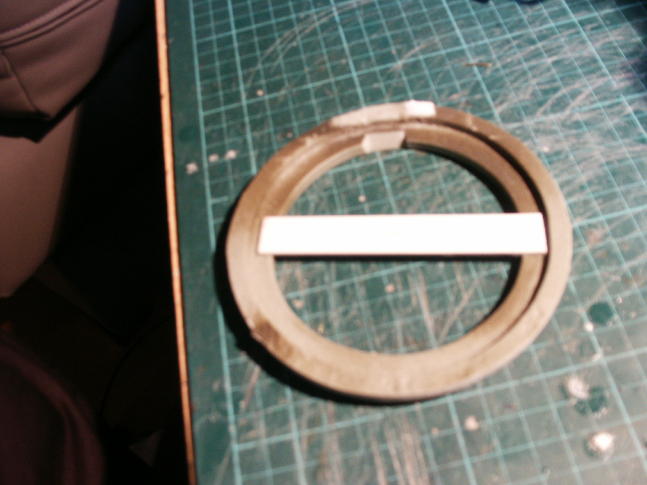 damit der Drehkranz in dei Wanne passt habe ich in den ebgeschnitenen rehkranz vom Betzlerturm eine Strebe eingeklebt,in der Mitte eine 0,5mm Bohrung zum Zentrieren des Kreisschneiders gebohrt und nun den Drehkranz in die Öffnung der Oberwanne gestzt und mit dem Kreisschneider eine Öffnung mit 145mm Durchmesser in die Oberwanne geschnitten,anschliessend wurden wieder aus 2mm ABS -Platten mehrere Ringe ausgestochen und so die Auflage des Drehkranzes gefertigt.
