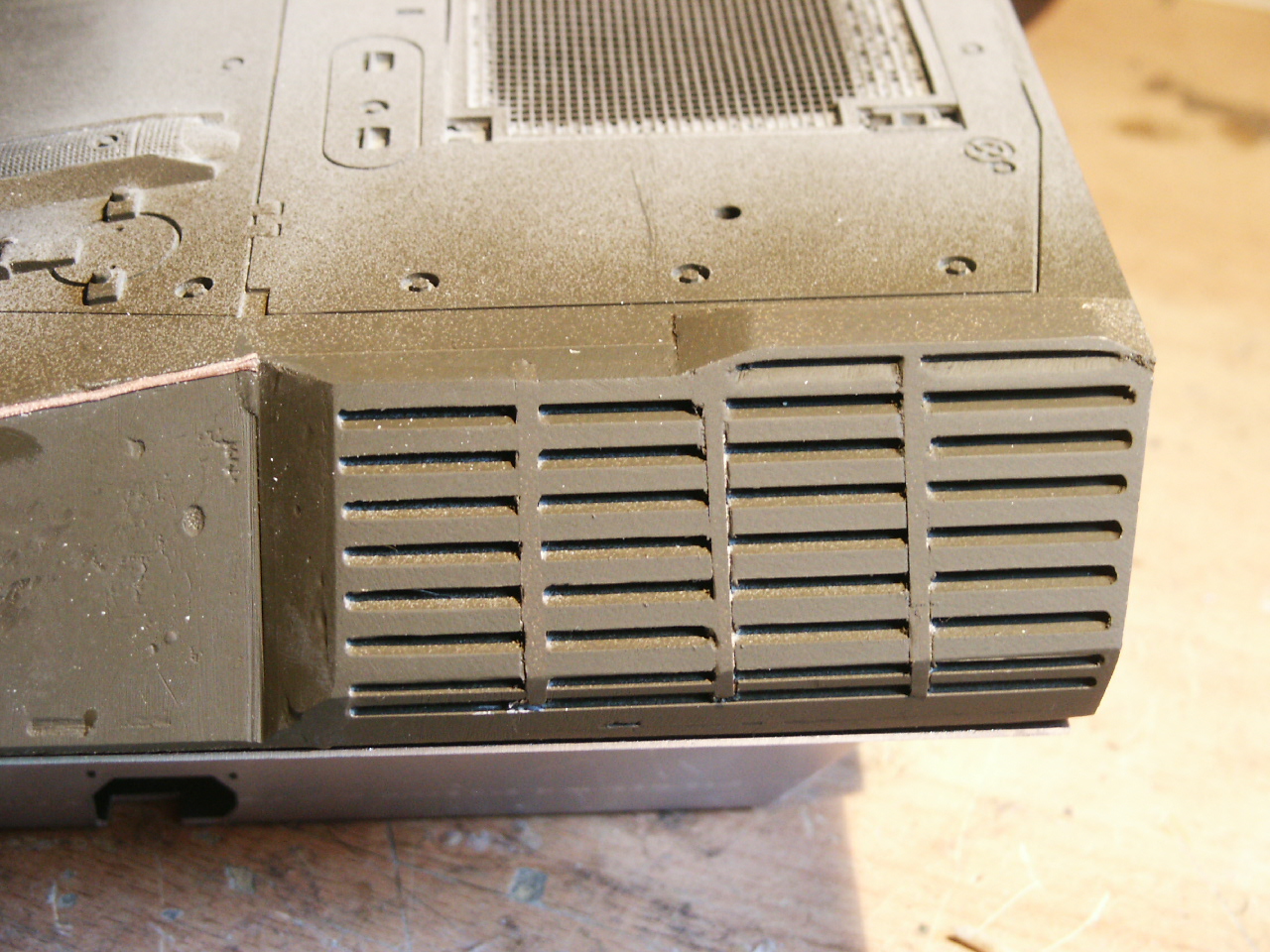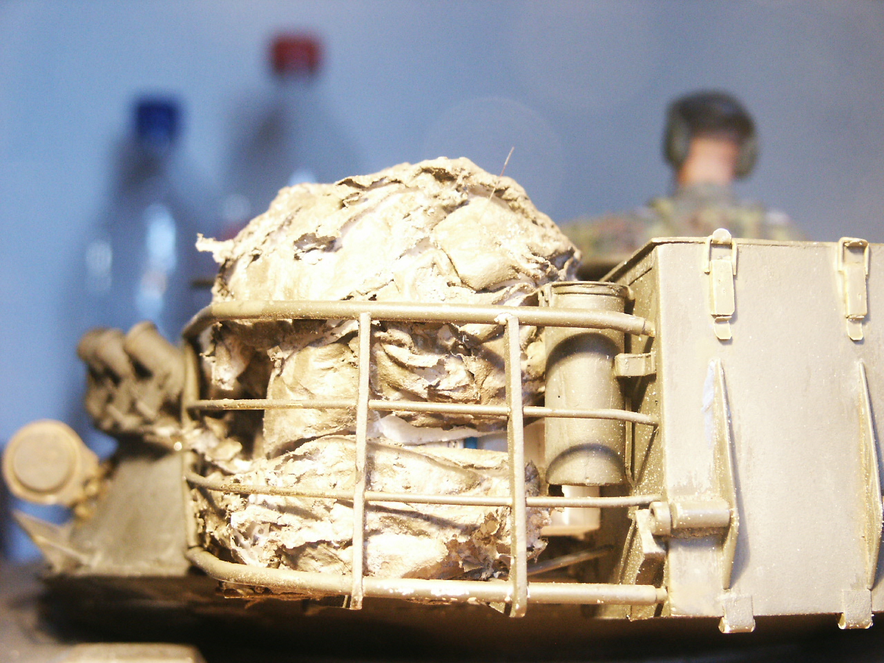 Ursprünglich war an dem Turm bereits die Zusatzpanzerung verbaut aber nach einigem Daraufschauen hatte mir einiges daran nicht gefallen ,so zum Beispiel die Optik wenn der Turm in Marschstellung nach hinten gedreht war und der Staukorb im Vergleich zu Originalbildern zu kurz bzw. zu weit hinten stand und nicht gerade sondern schräg nach oben gelaufen ist.