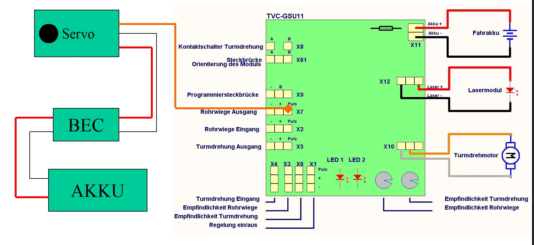 Wenn ich noch irgendwo Platz im Turm meines Panzers für den Optokoppler finden könnte wäre es eine praktikable Alternative... Übrigens, dass der BEC von SGS nur 1A am Servoausgang liefert hätte mir ein paar schlaflose Nächte erspart...in der Anleitung hab ich´s leider nicht gemerkt. Aus dem Forumbeitrag sehe ich aber, dass ihr auch schön mit dem SGS Modul kämpfen musstet Alleine die Justierung und Initialisierung bringen einen an den Rand der Verzweiflung. Als externe Stromquelle hab ich schon einen Akku mit 9,6V und 2200mAh für den Turmantrieb da...