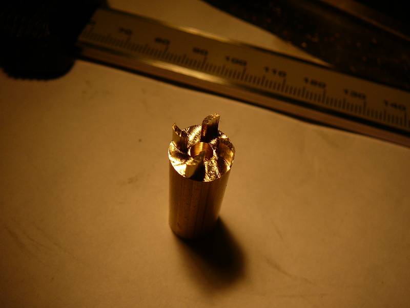 Das Material ( Ms-Rund 10mm ) wurde also diesmal - mit Kernbohrung zur Orientierung des 2mm-Fräsers - in das 3-Backenfutter des Teilapparates gespannt. Wenn das Programm durchgelaufen war, wurde logischerweise das Futter um 90 Grad verdreht, weil ich vier Schaufeln brauche. -- Gruß Hartmut