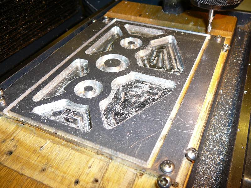 Wer will schon mit der Hand rumkurbeln, wenn man eine CNC-Maschine hat? Also habe ich mich doch bereit gefunden, \"schnell noch\" die kleinen Programme für das Abfräsen der \"stehengebliebenen Felder\" siehe oben ) zu schreiben und auszuprobieren, ob nun alles ganz bis zuende richtig läuft - vor allem, in der richtigen Reihenfolge.