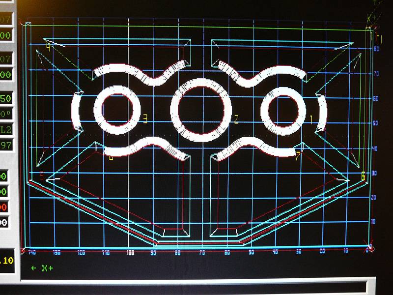 Auf dem Bild sieht man die Kontroll-Einblendung der dünnen, roten Fräsbahnen und der weißen Kurven-Punkte.