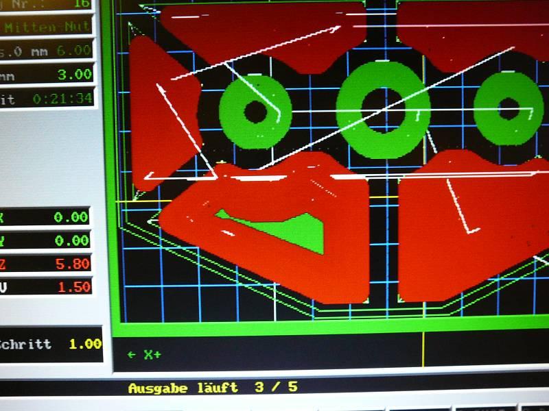 Nun geht es weiter, denn ich habe - am späten Samstag - wieder einige Stunden vor der Fräse zugebracht, um endlich den ersten realen Fräsdurchgang zu verfolgen - und bei Zweifeln rechtzeitig auf den großen roten Knopf zu drücken...