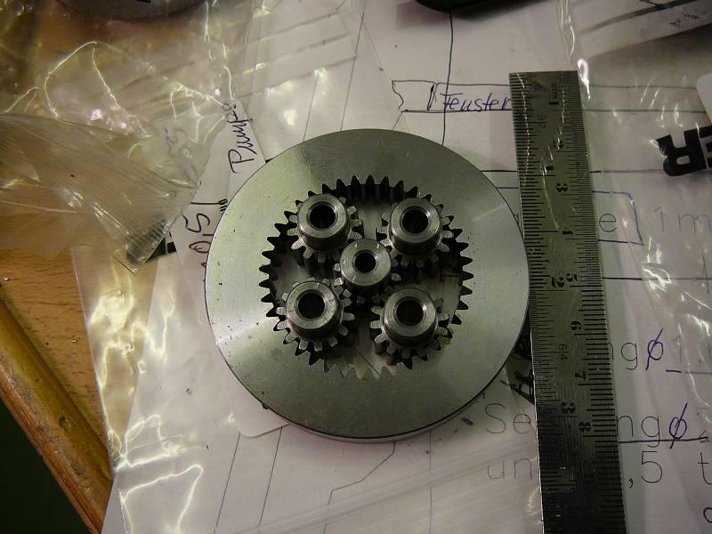 Aber ich habe an die Endabtriebe des zughörigen und noch zu bauenden Überlagerungs-Lenkgetriebes gedacht und gleich die entsprechenden Zahnräder für die Planetengetriebe mit Modul 1 =( Zahngröße ) mitbestellt. Um diese Teile fachgerecht zusammenzustellen, muß auch schon an ein paar Dinge vorher gedacht werden. Die Teilung der vier Planetenräder läßt sich am besten herstellen, wenn deren Bohrloch-Achsen(-Verbindungslinien ) genau rechtwinklig zueinander stehen.