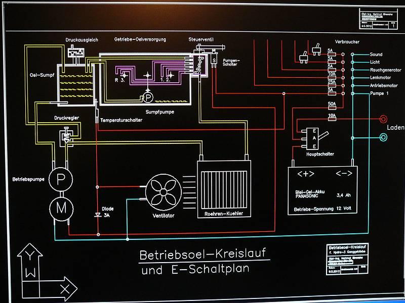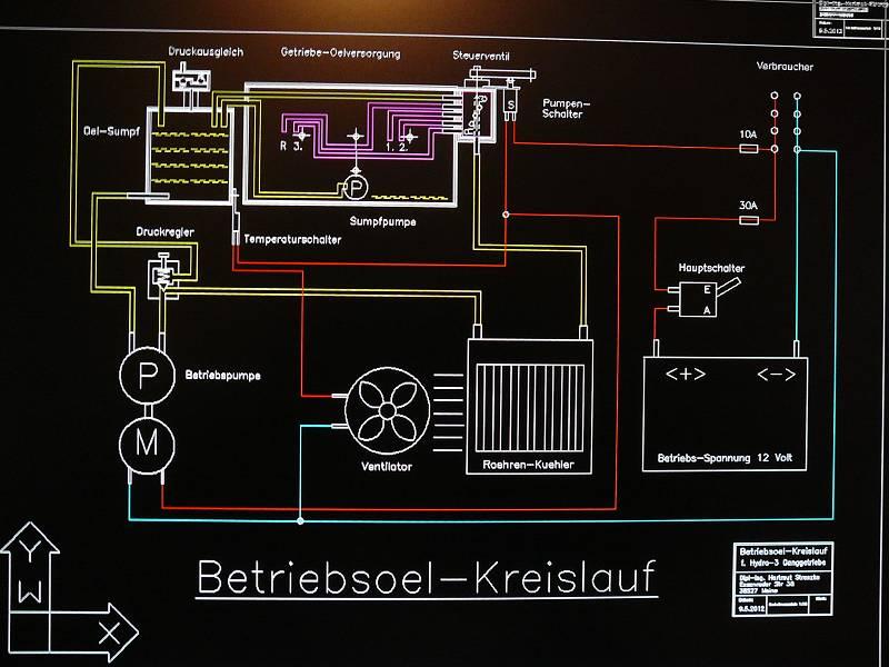 Ich habe schließlich doch noch - entgegen meiner ursprünglichen Absicht - die schon gezeichneten Elektrowege ergänzt und vervollständigt. Das erschien mir jetzt plötzlich wichtig, nachdem ich doch ein paar klene Varianten mit der Öl-Kühlung durchgedacht hatte. Der Weg zu den nun einbezogenen Verbrauchern war da nicht weit und der Platz auf dem Plan gestattete es auch.